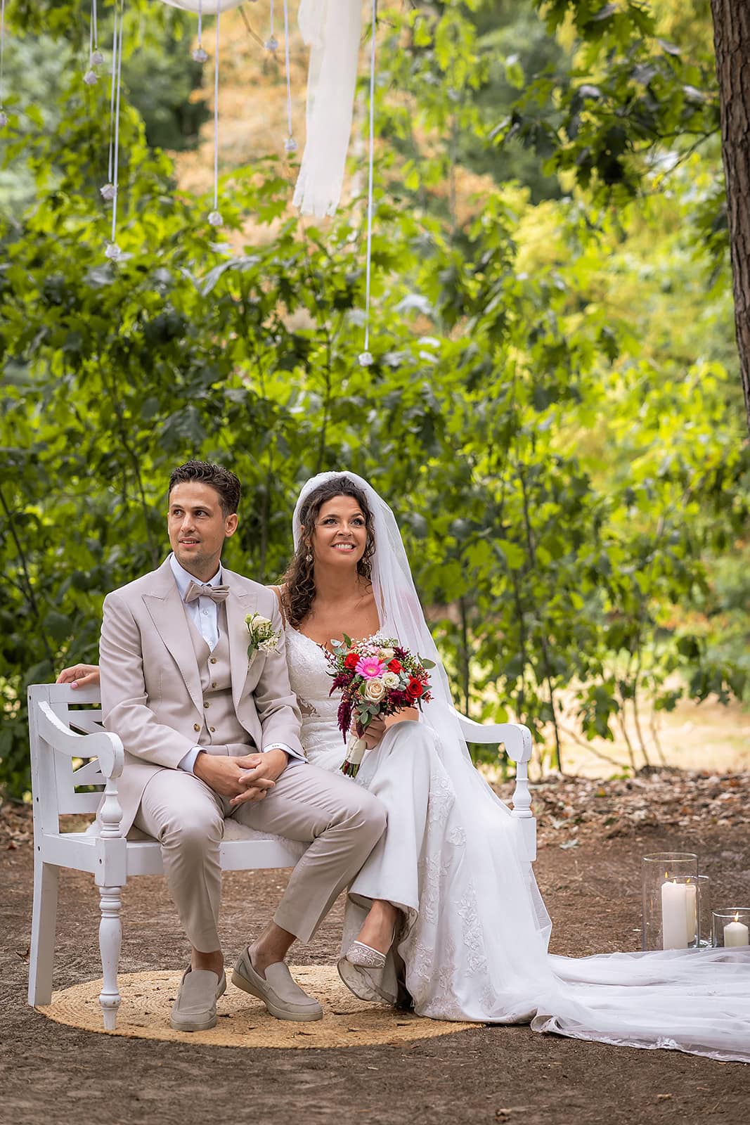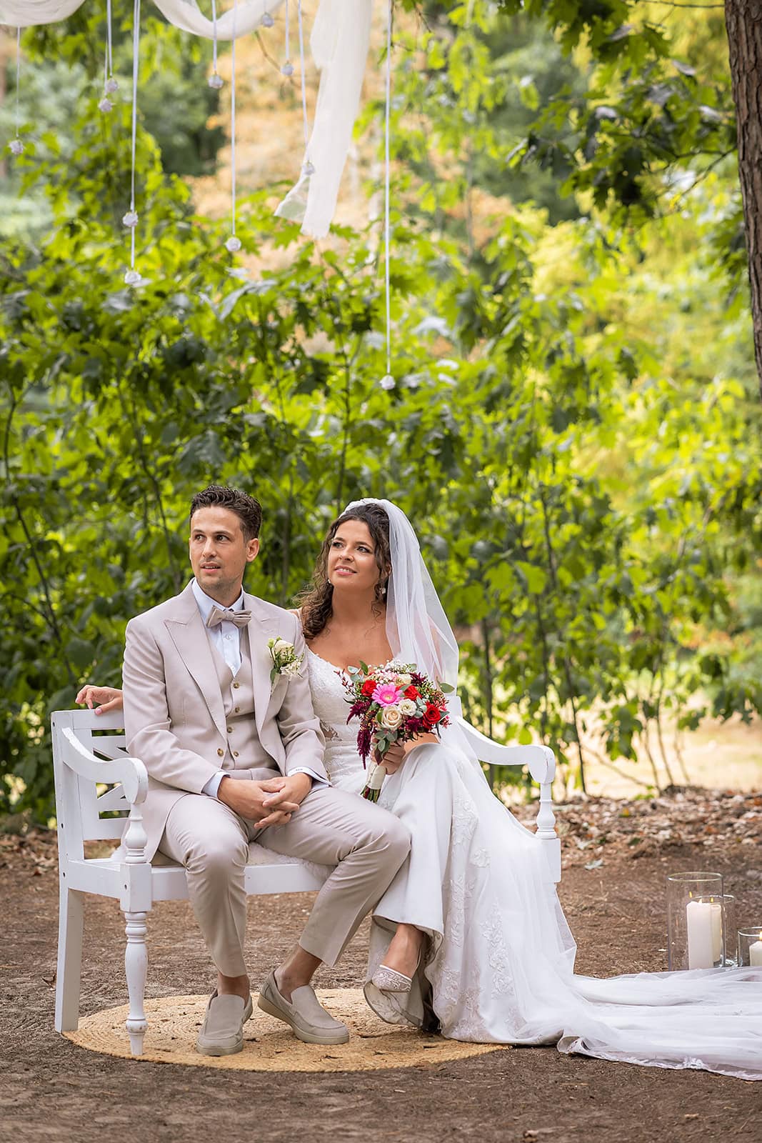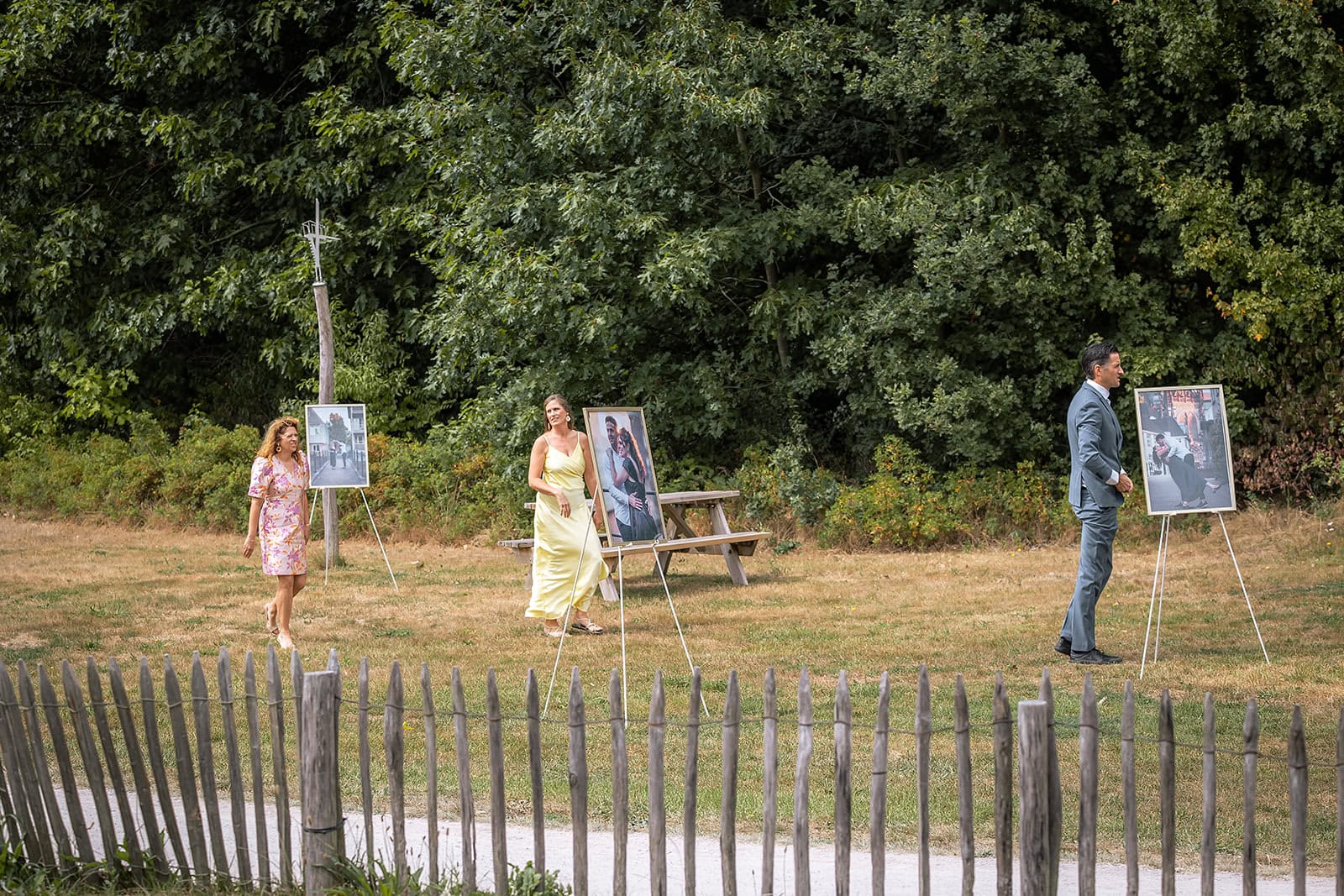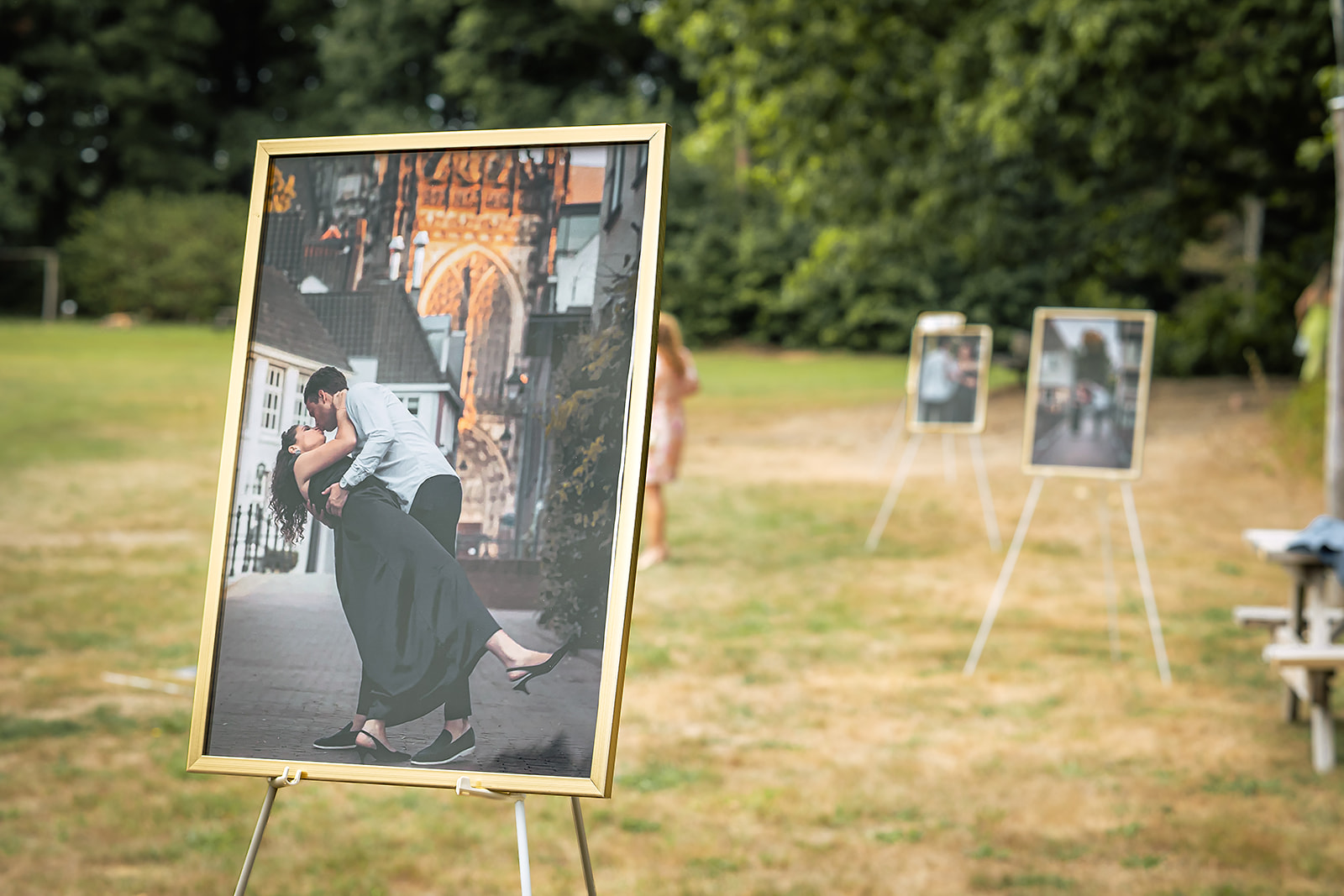 Op locatie startte ik met foto’s van de omgeving. Langs het pad naar de ceremonie stonden grote prints van hun door mij gemaakte favoriete foto’s. Zo sfeervol en persoonlijk, ik hou daar echt van. Toen Debby en Robbert alles even hadden bekeken, gingen we samen met videograaf Elroy van Visuals by Elroy een rondje lopen voor de pre weddingshoot. Zijn video’s en mijn foto’s vormden samen een perfecte mix.
