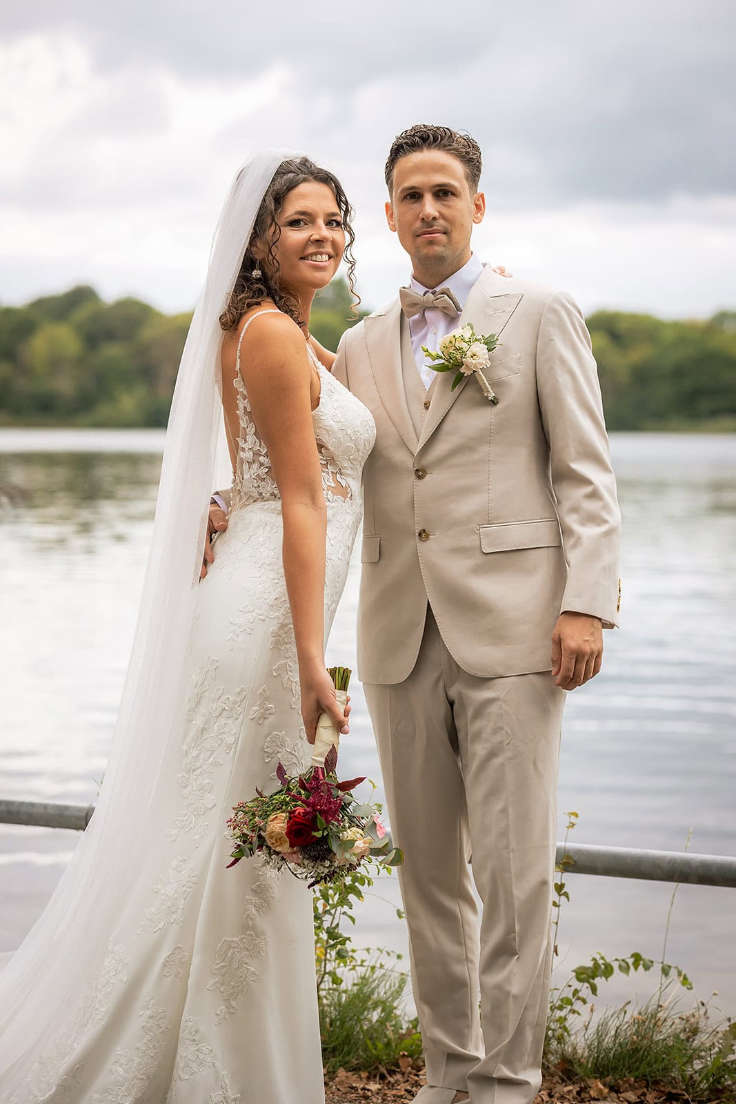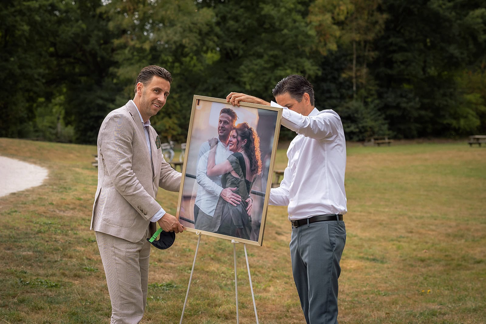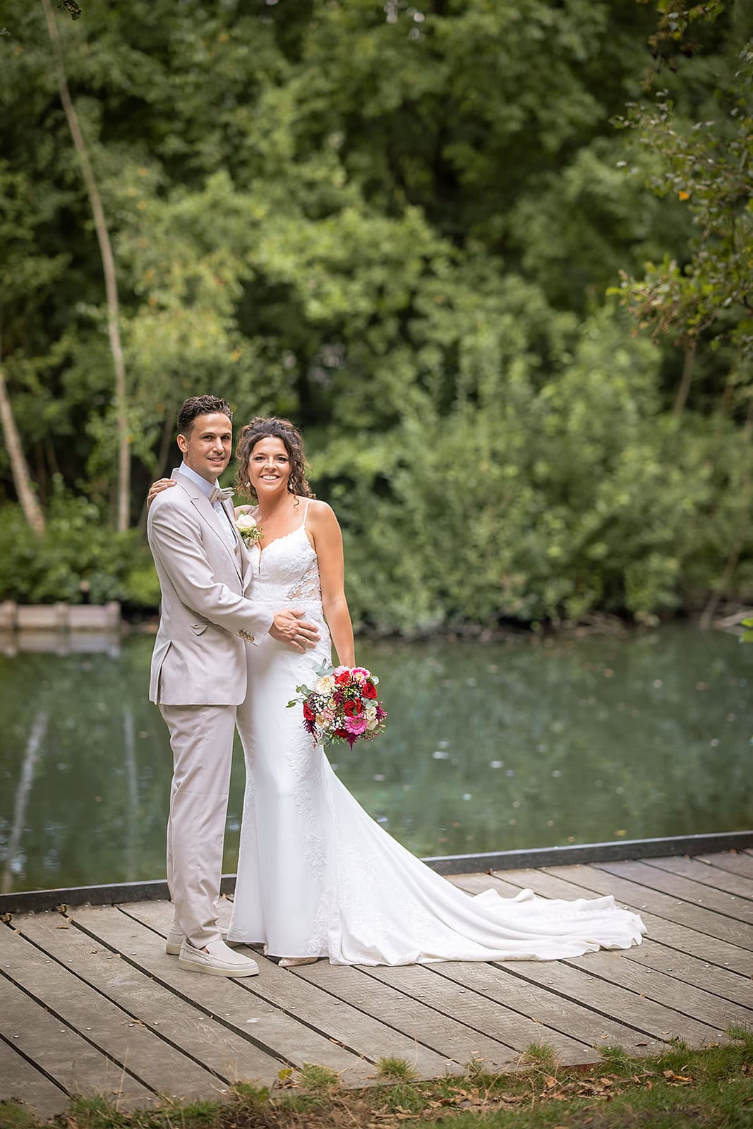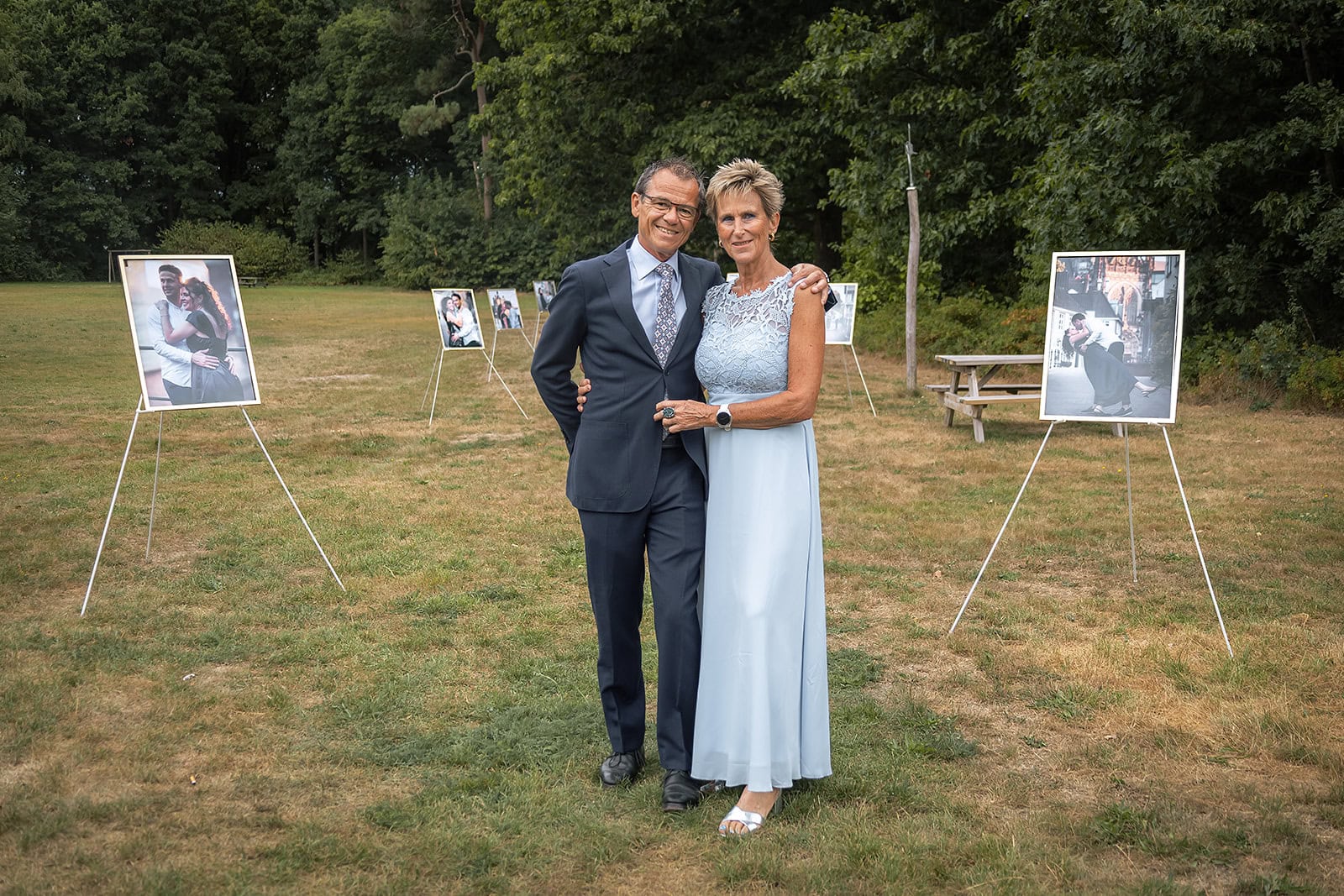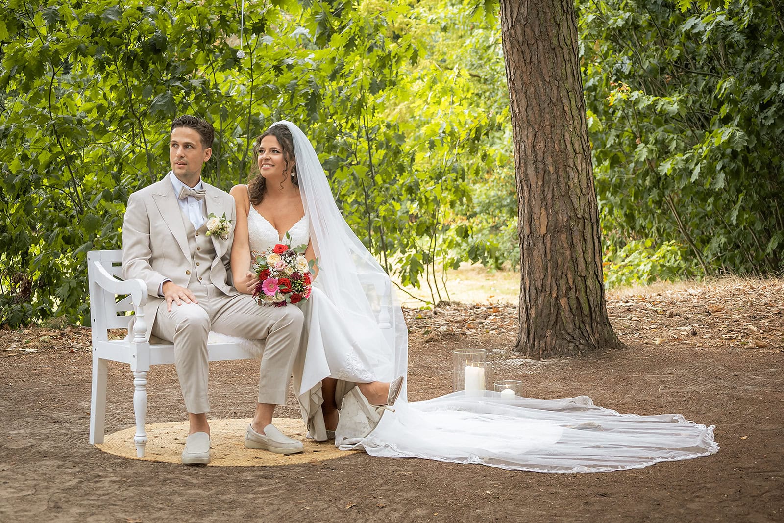 Op locatie startte ik met foto’s van de omgeving. Langs het pad naar de ceremonie stonden grote prints van hun door mij gemaakte favoriete foto’s. Zo sfeervol en persoonlijk, ik hou daar echt van. Toen Debby en Robbert alles even hadden bekeken, gingen we samen met videograaf Elroy van Visuals by Elroy een rondje lopen voor de pre weddingshoot. Zijn video’s en mijn foto’s vormden samen een perfecte mix.