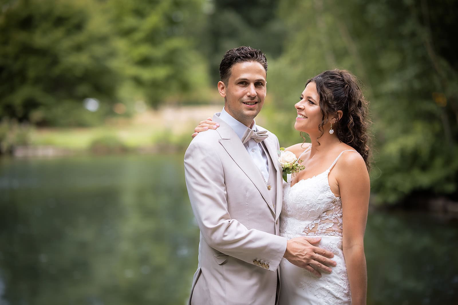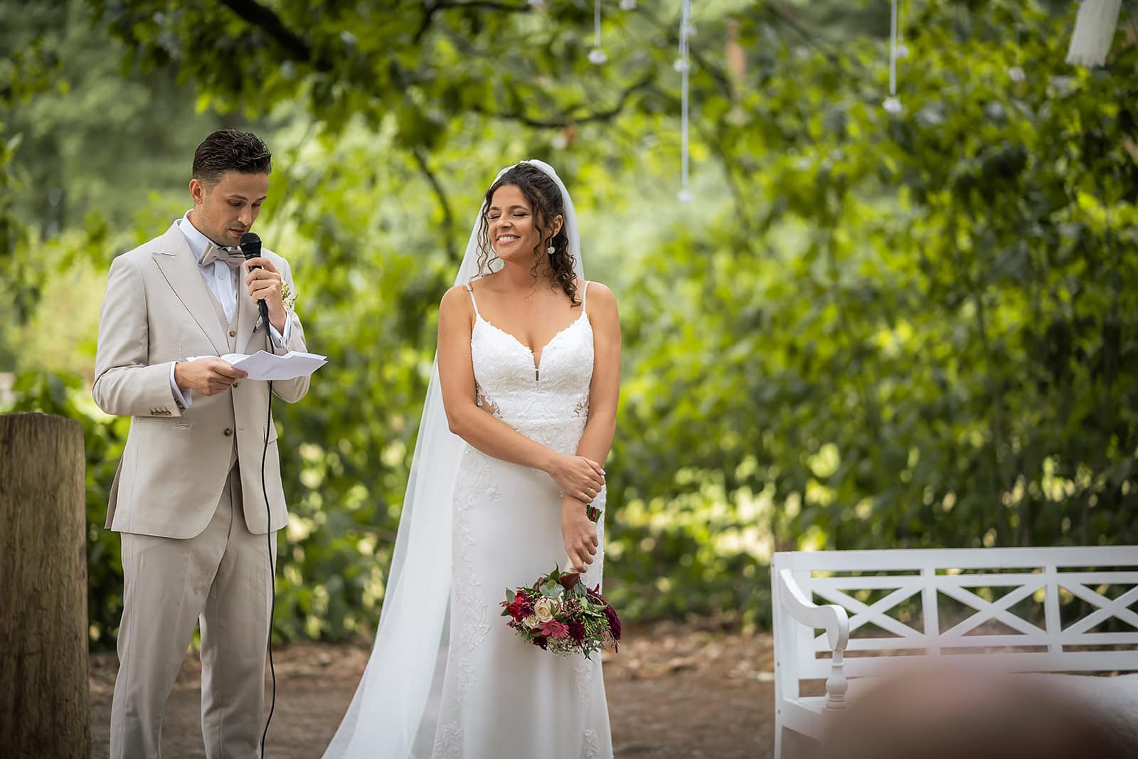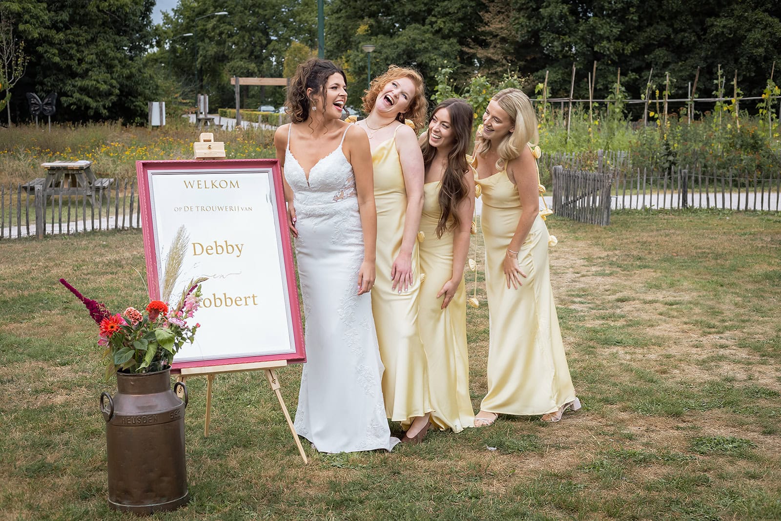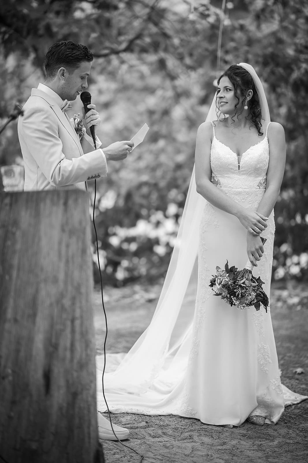 Op locatie startte ik met foto’s van de omgeving. Langs het pad naar de ceremonie stonden grote prints van hun door mij gemaakte favoriete foto’s. Zo sfeervol en persoonlijk, ik hou daar echt van. Toen Debby en Robbert alles even hadden bekeken, gingen we samen met videograaf Elroy van Visuals by Elroy een rondje lopen voor de pre weddingshoot. Zijn video’s en mijn foto’s vormden samen een perfecte mix.