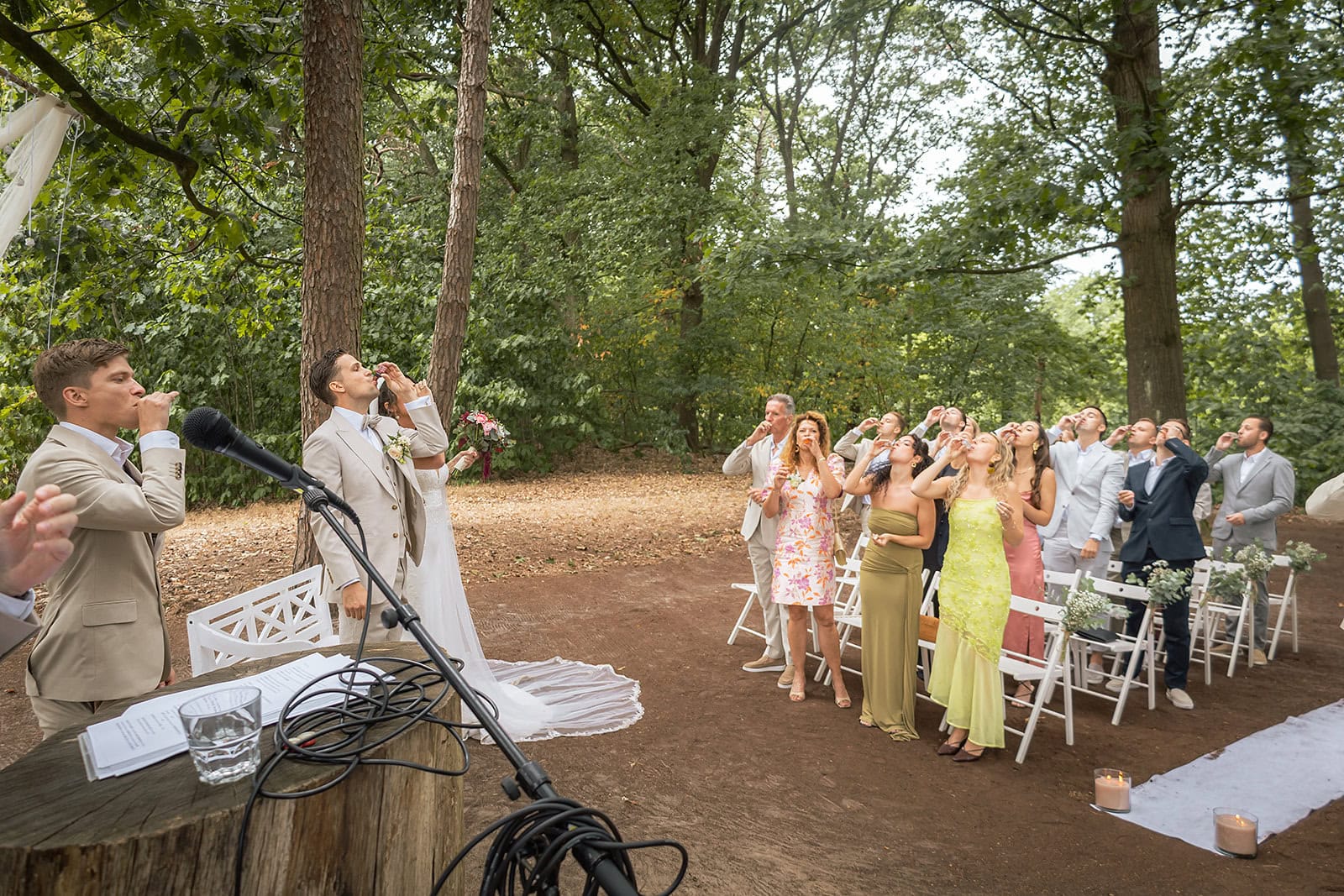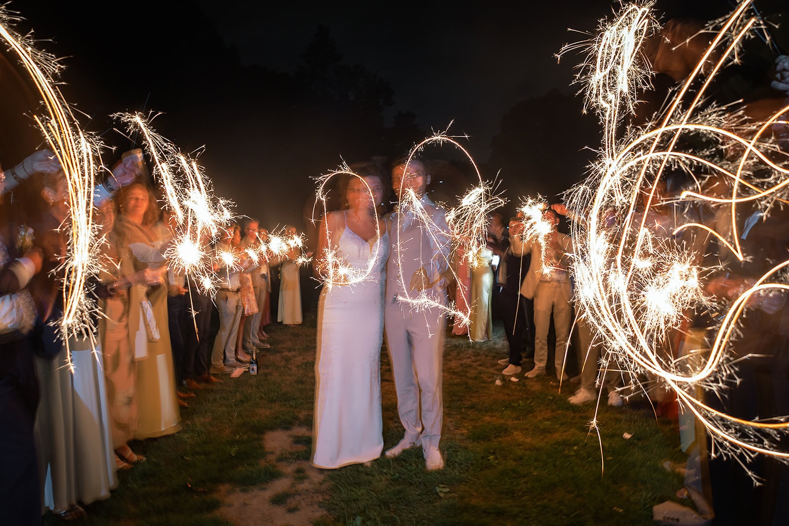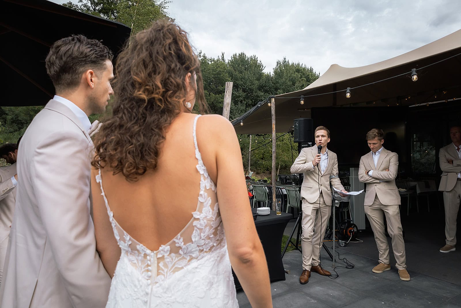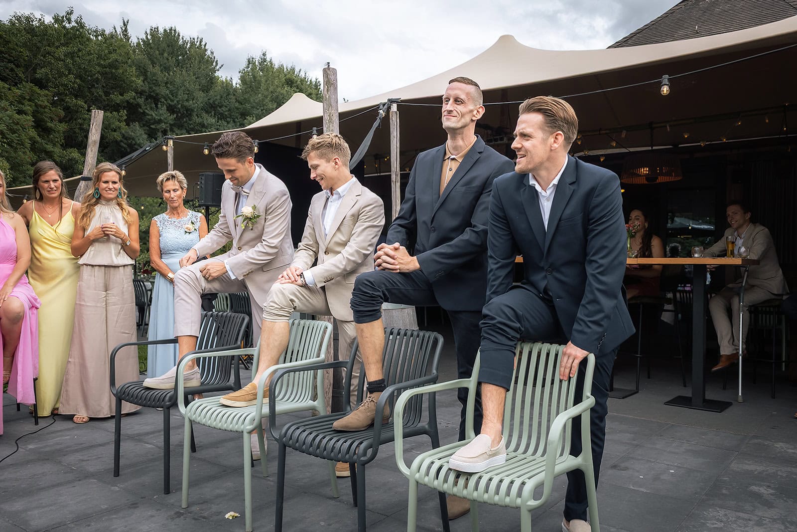 Na de ceremonie ging het moeiteloos over in een gezellige middag met taart, toast, spelletjes van het bruidspaar en mooie speeches. Een dag die precies liet zien waarom ik zo graag bruiloften fotografeer: echte momenten, pure emoties en mensen die genieten. We sloten de dag af met een sparkler send off tussen de sterretjes. Ik liet Debby en Robbert hun initialen in spiegelbeeld schrijven voor een van de laatste foto’s. Een speels en romantisch einde van een dag die voor mij voelde als een warm Brabants feestje.