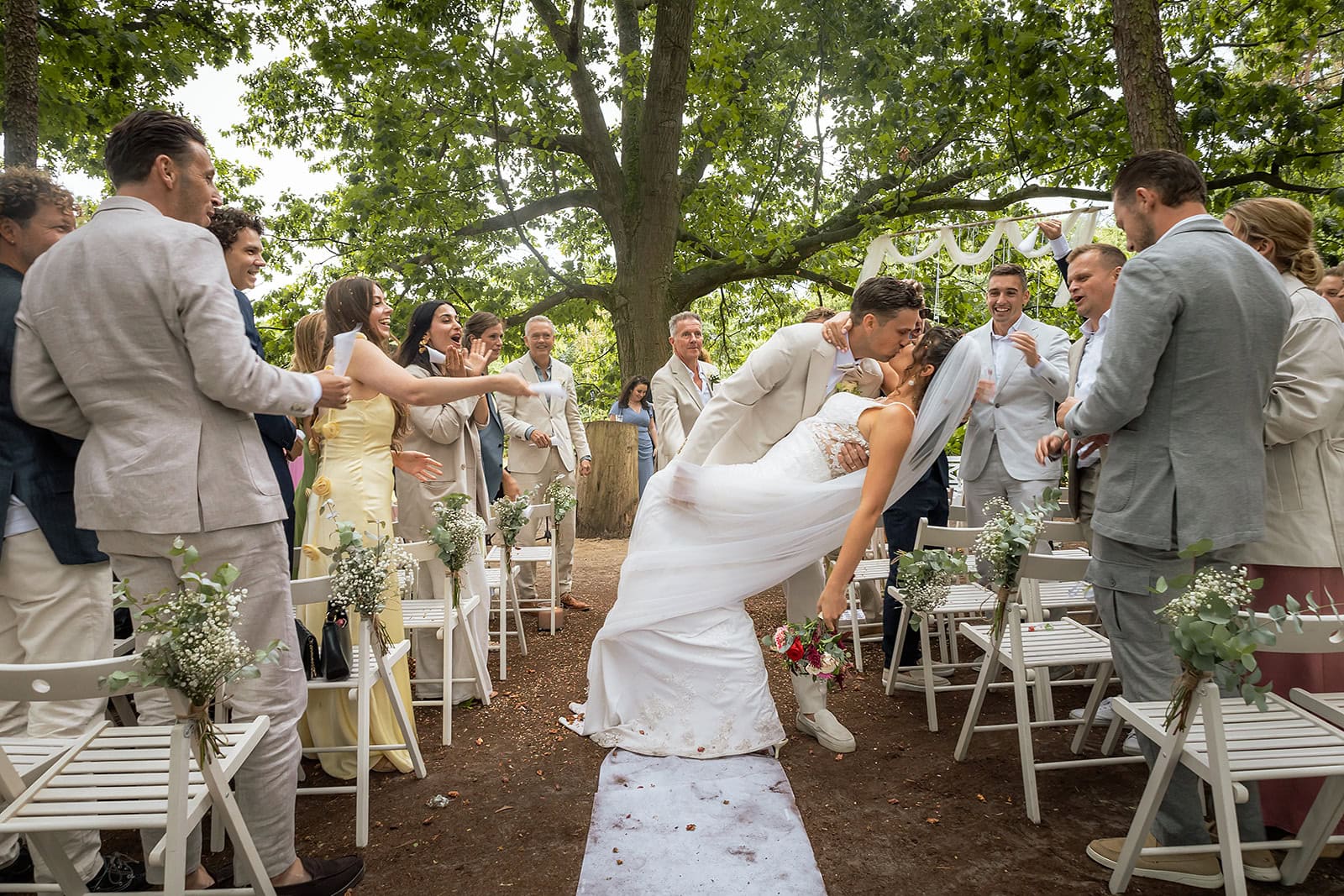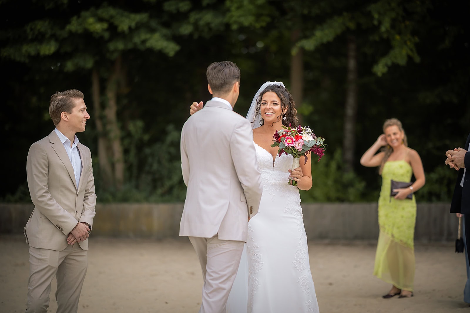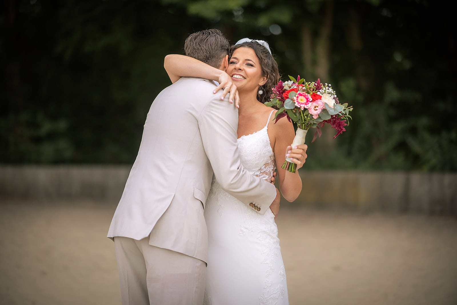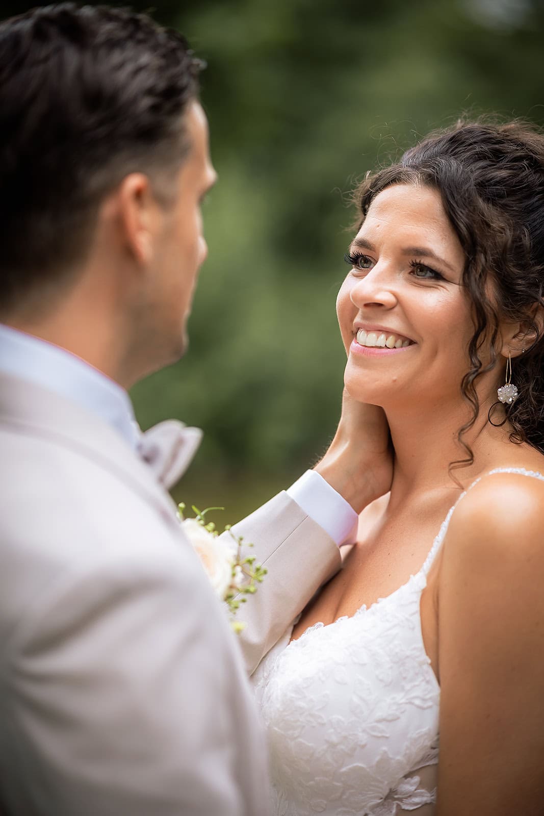 De dag begon thuis, waar de laatste voorbereidingen werden gedaan. Daarna volgde de first look, een moment dat altijd iets magisch heeft. Debby en Robbert zagen elkaar voor het eerst en de spanning, de glimlach, de liefde… alles viel op z’n plek. Typisch Brabants vervolg: we aten eerst heerlijke worstenbroodjes bij hen thuis voordat we naar de Helden van Kien reden.