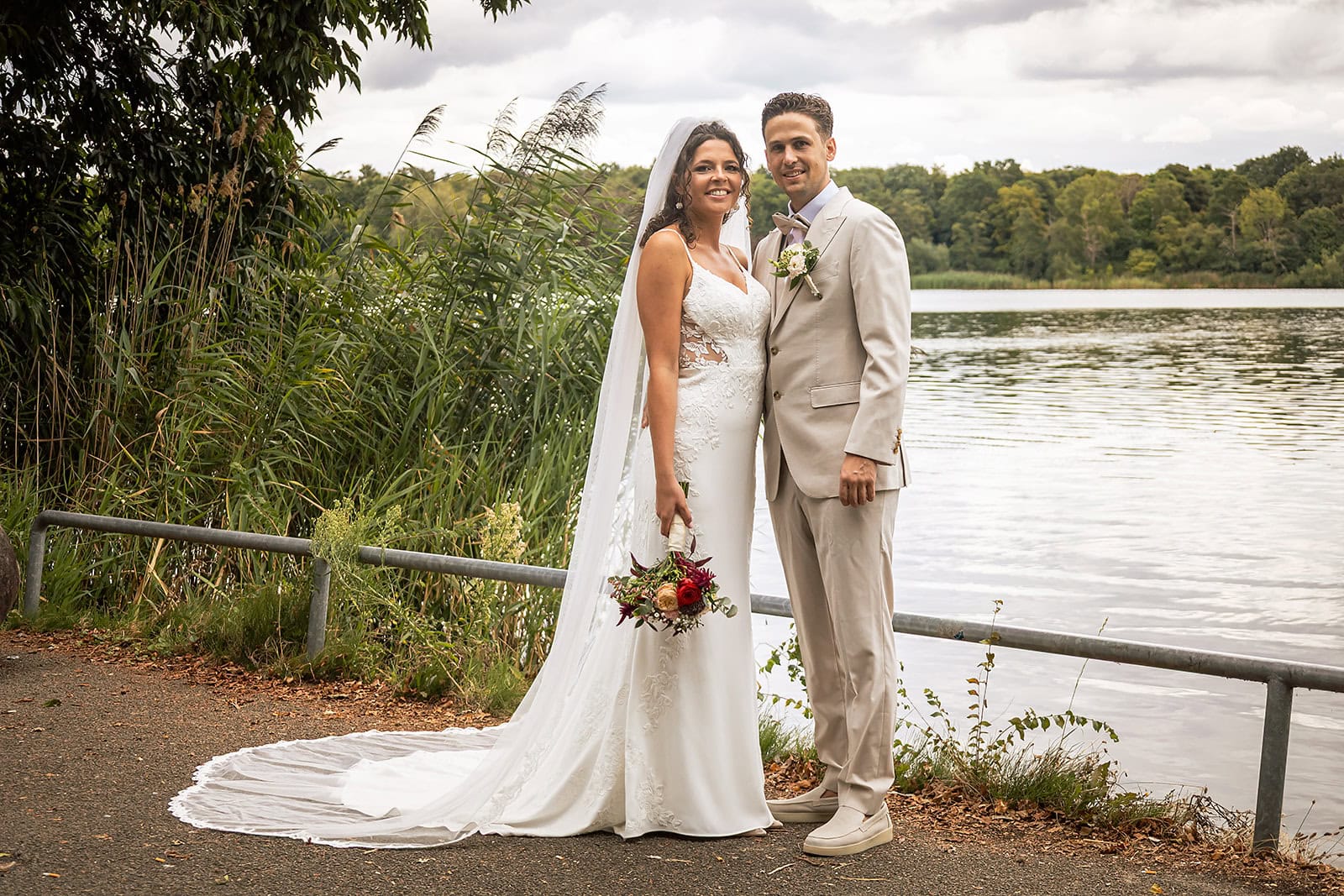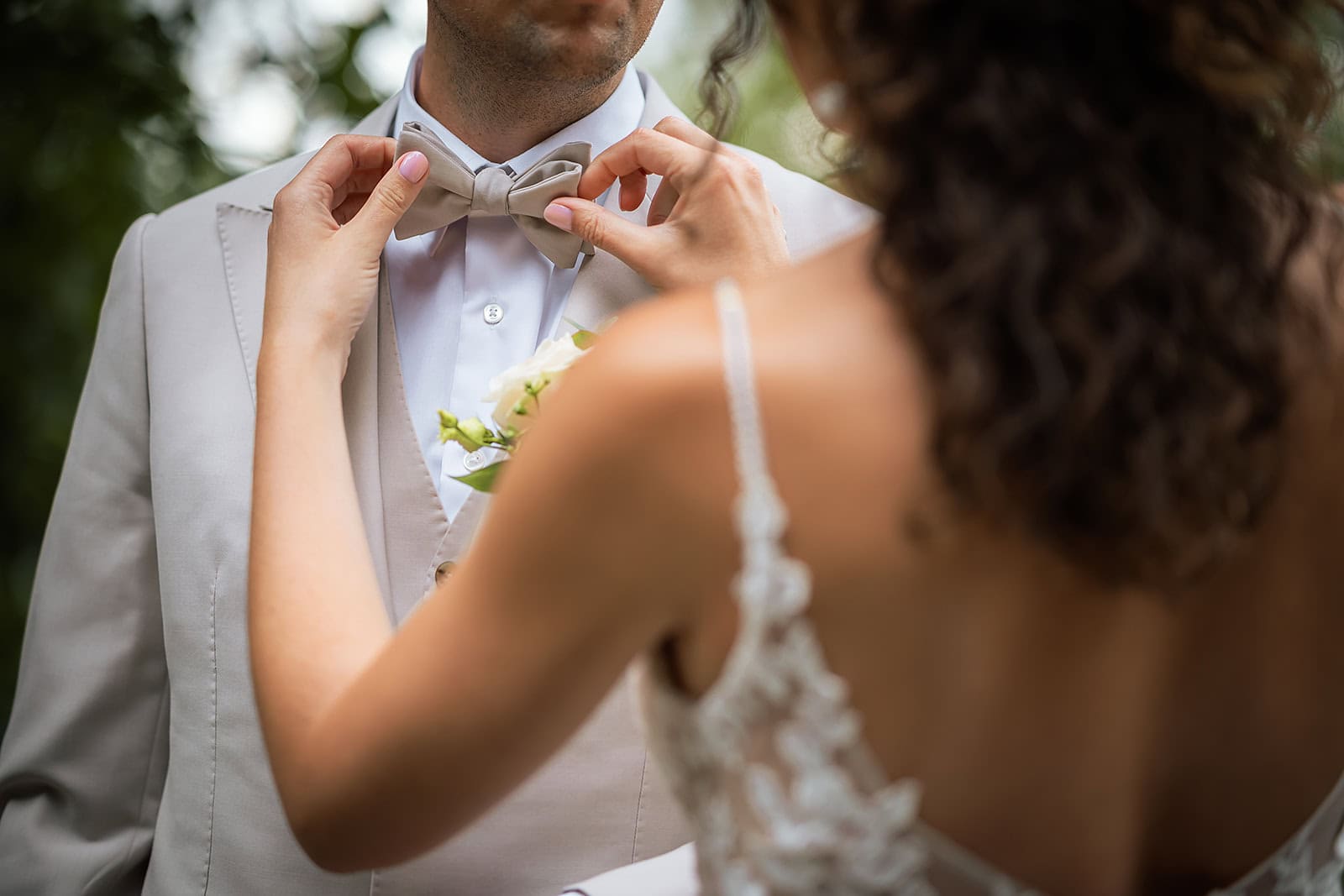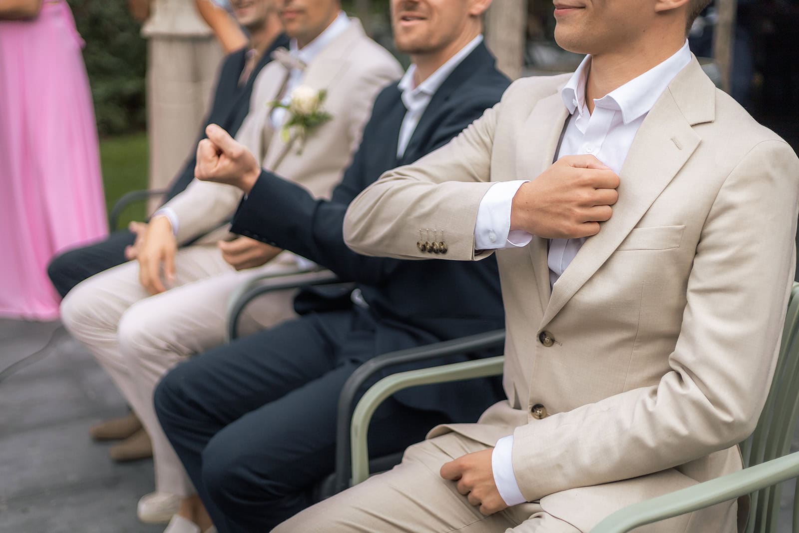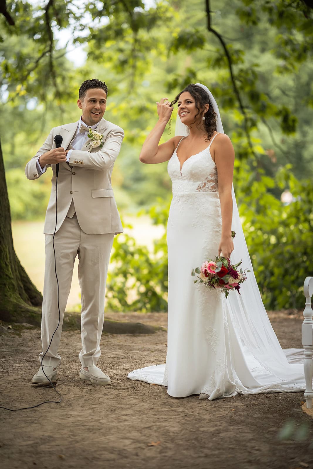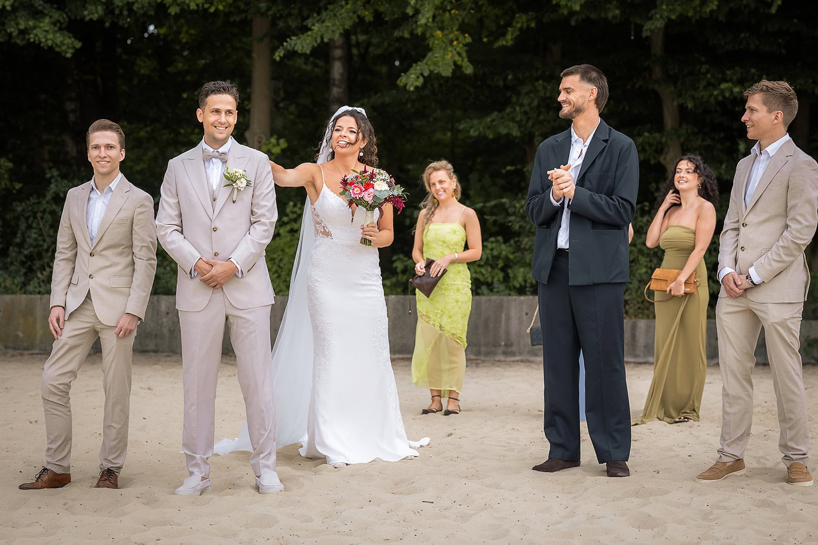 De dag begon thuis, waar de laatste voorbereidingen werden gedaan. Daarna volgde de first look, een moment dat altijd iets magisch heeft. Debby en Robbert zagen elkaar voor het eerst en de spanning, de glimlach, de liefde… alles viel op z’n plek. Typisch Brabants vervolg: we aten eerst heerlijke worstenbroodjes bij hen thuis voordat we naar de Helden van Kien reden.