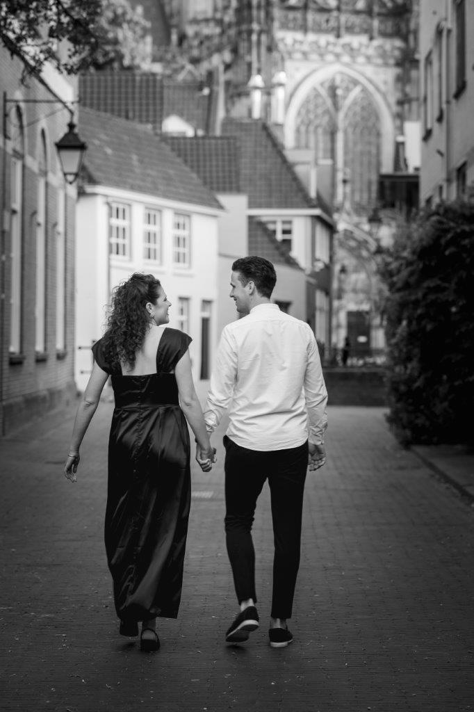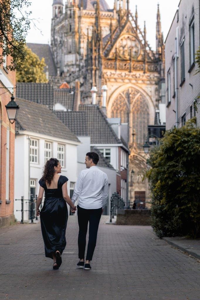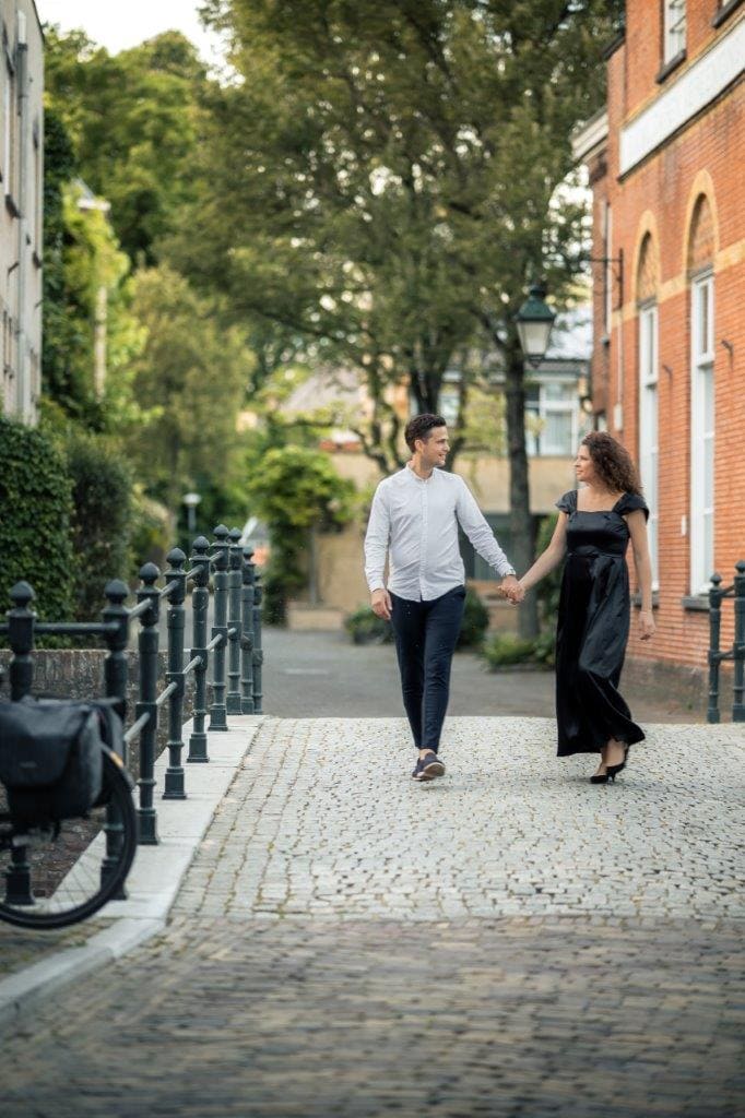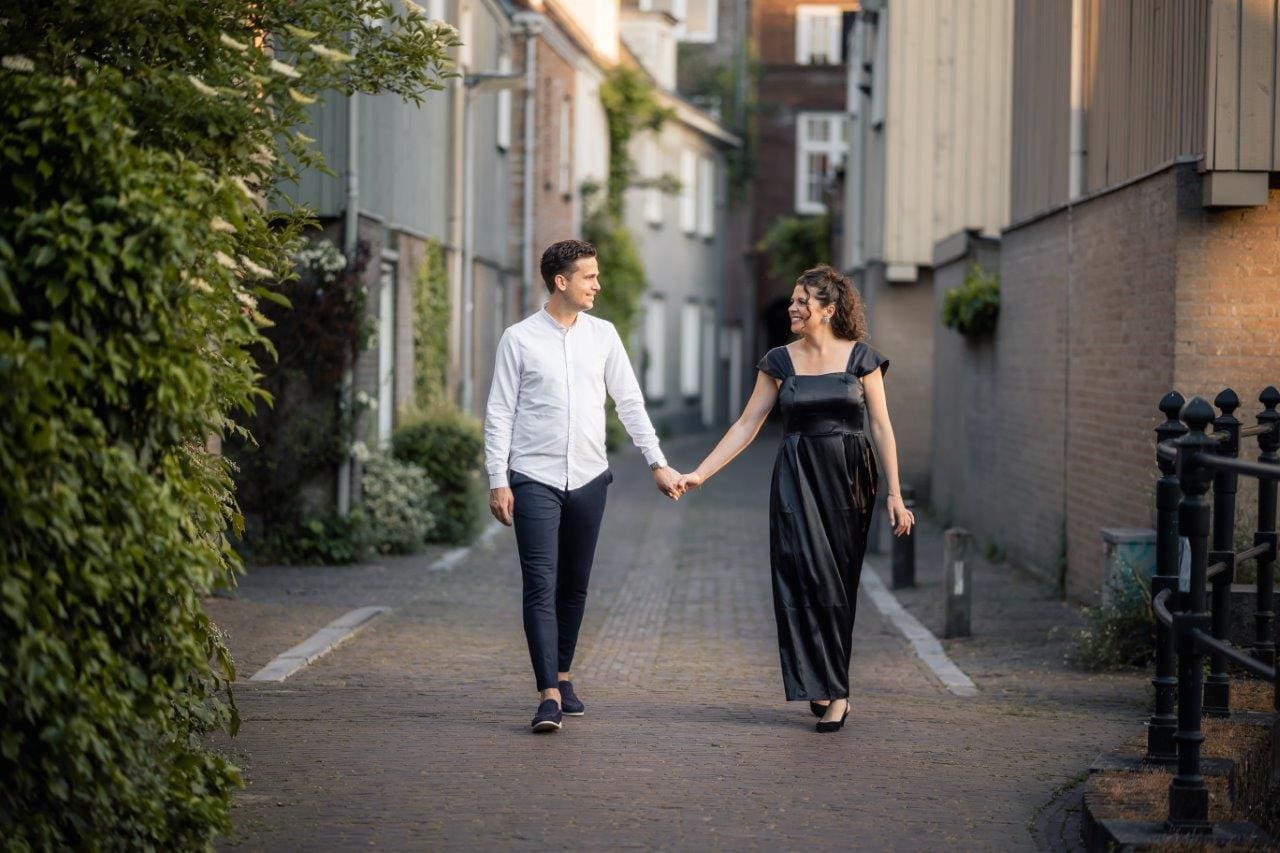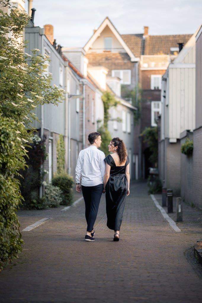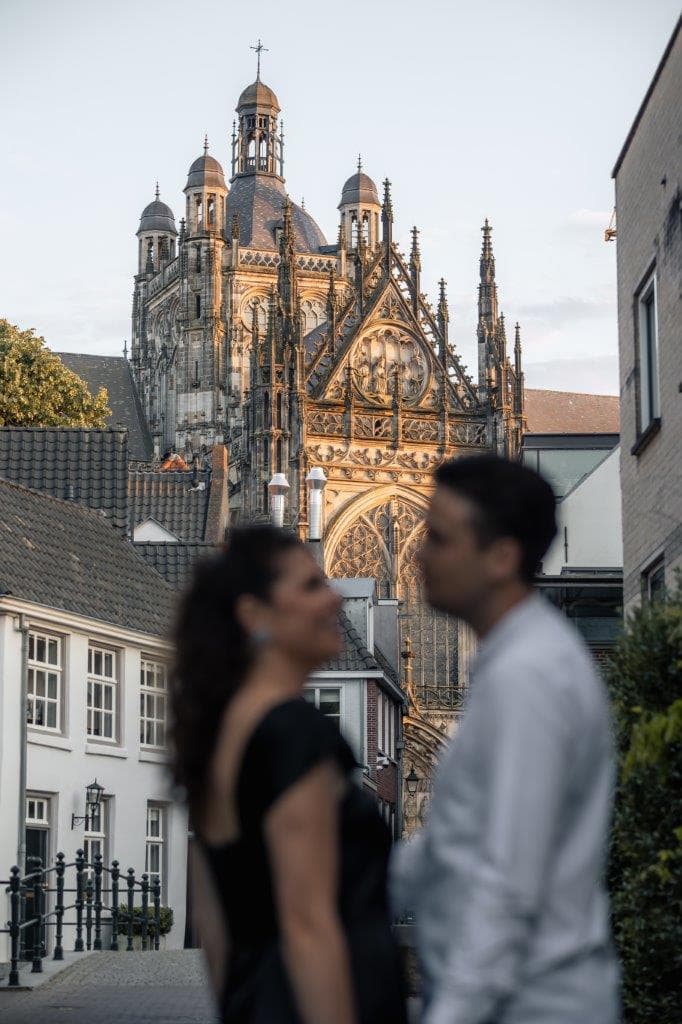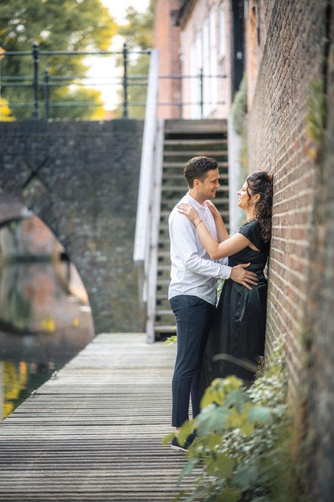 Wat ik zo leuk vind aan mijn werk als fotograaf, is dat ik op de mooiste plekken kom. Voor deze loveshoot met Debby en Robbert reisde ik af naar het sfeervolle Den Bosch – een stad die voor mij helemaal nieuw was. Na wat vooronderzoek ontdekte ik het charmante straatje ‘In Den Boerenmouw’, verscholen net achter de winkelstraat. Een echte verborgen parel! We namen uitgebreid de tijd om hier te fotograferen, en ik heb mijn best gedaan om de karakteristieke omgeving zo goed mogelijk in beeld te brengen.