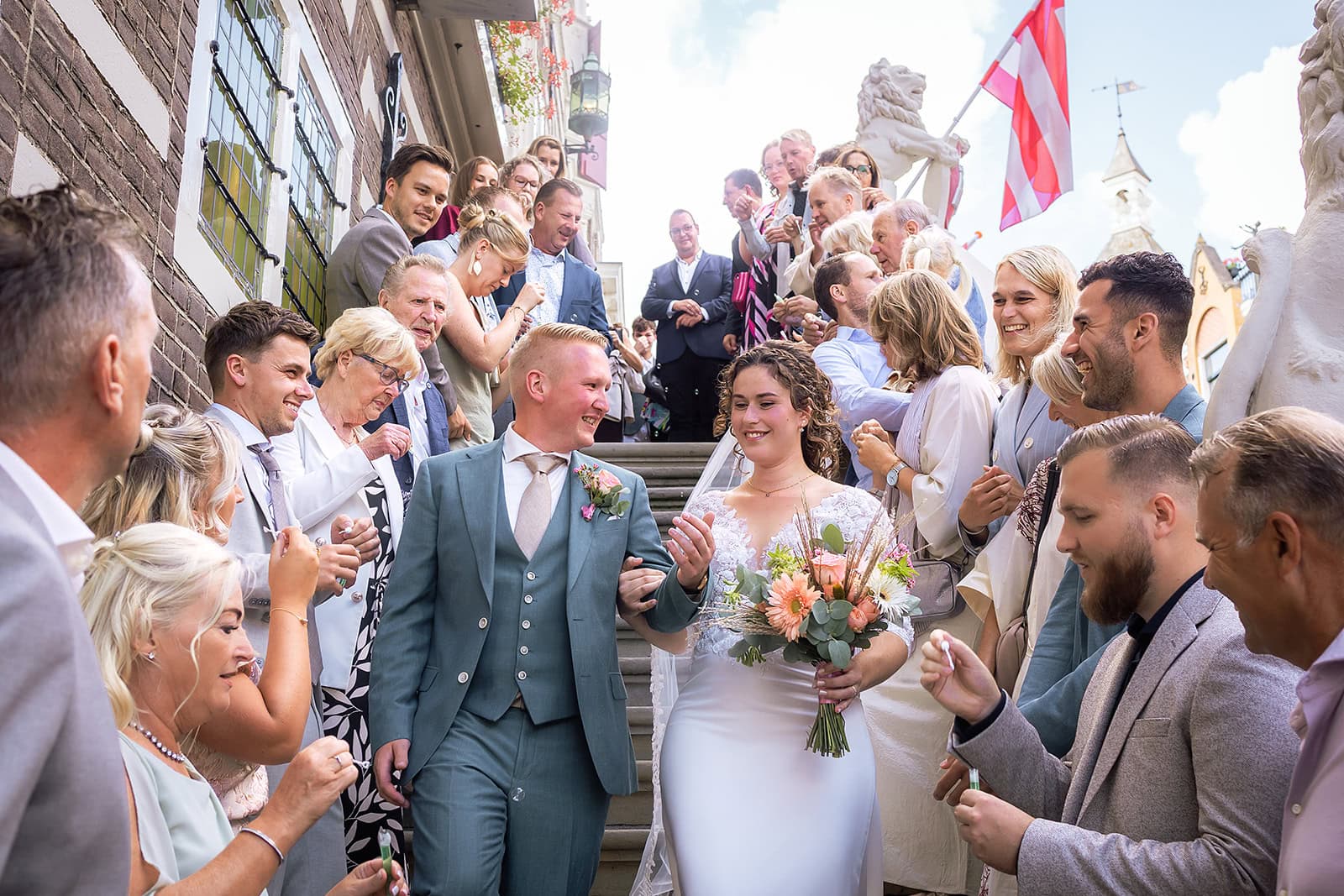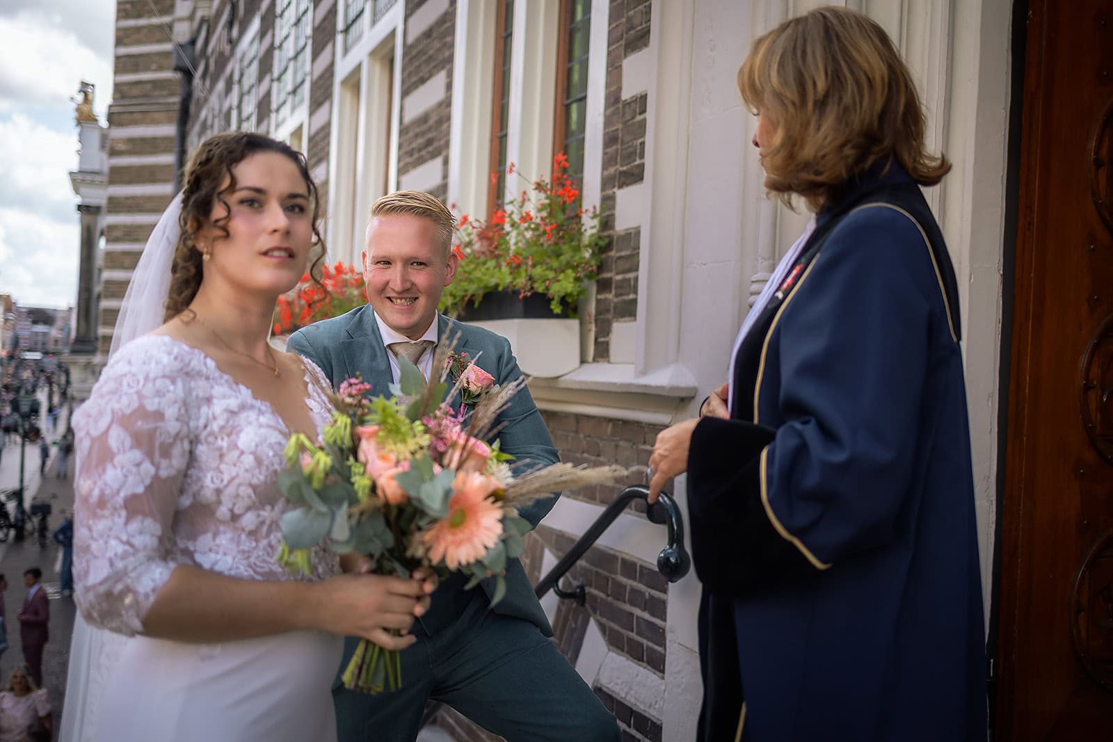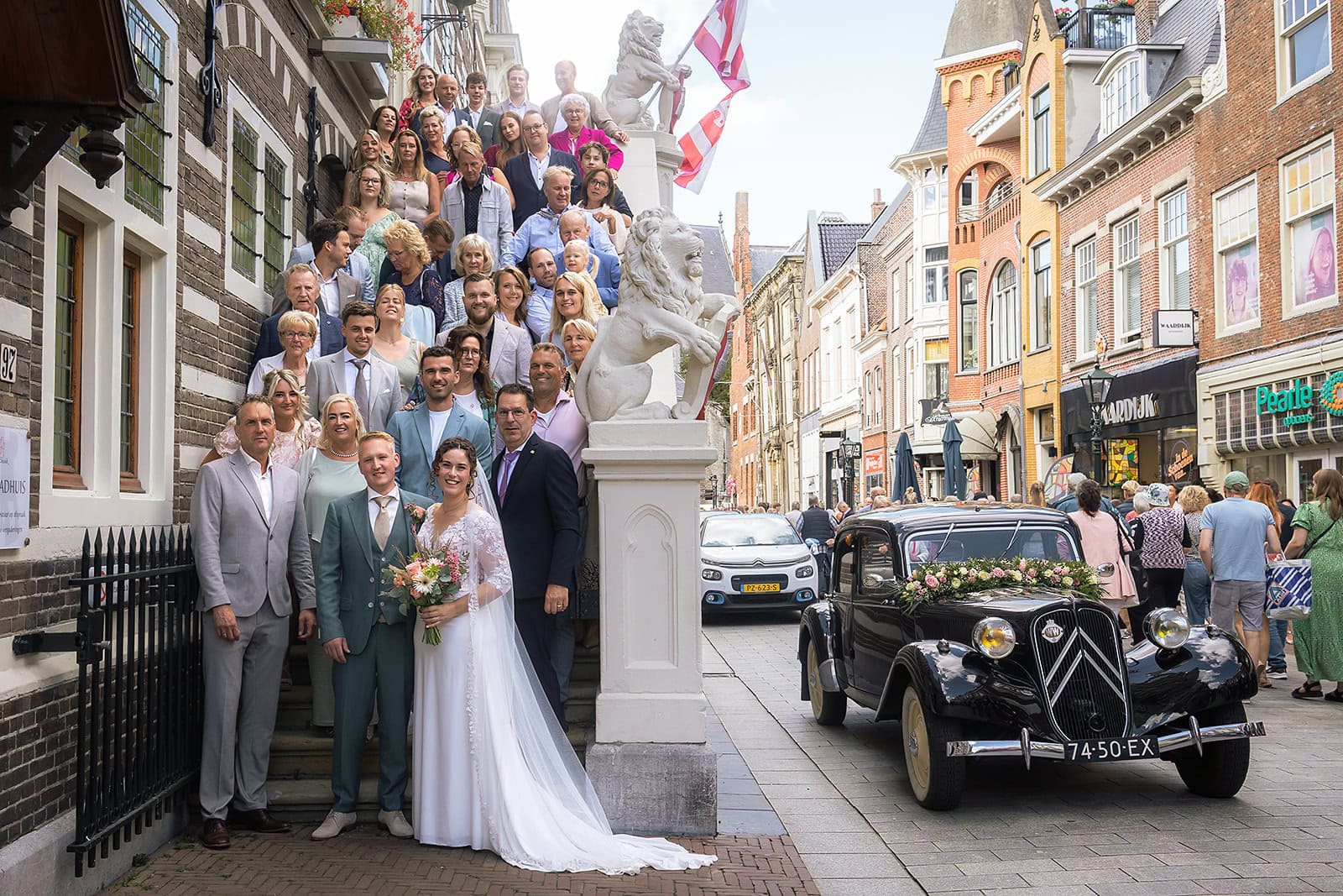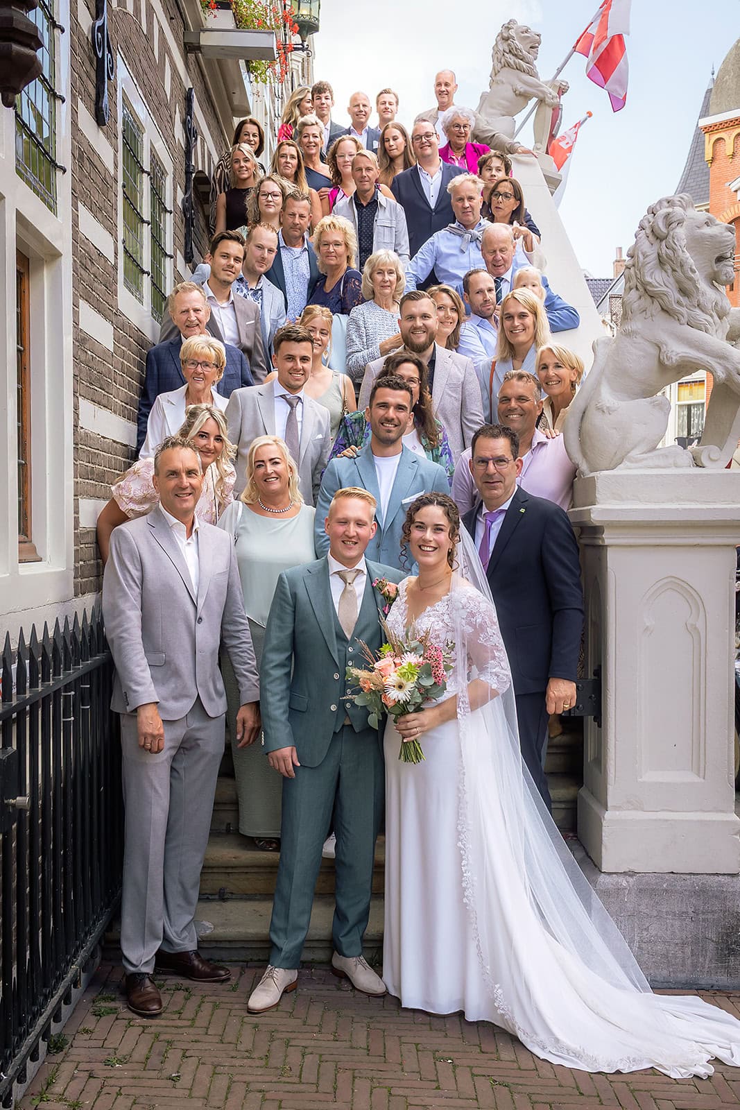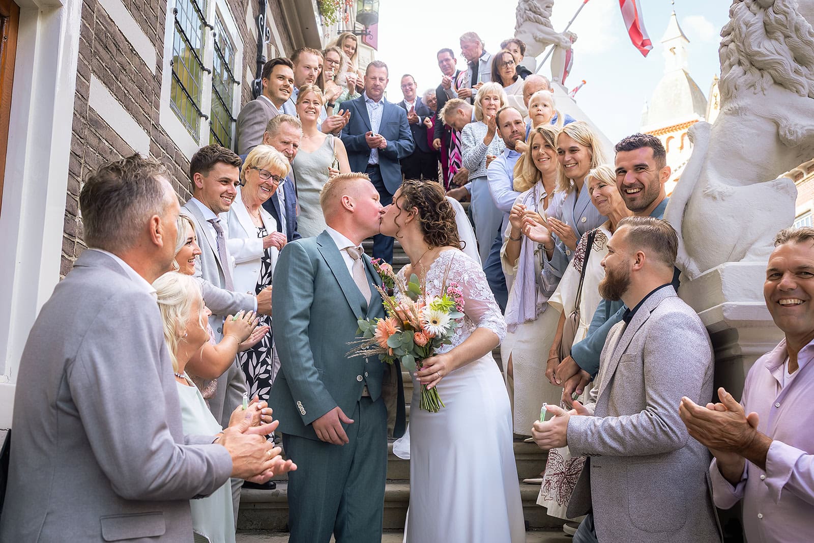 Daarna reden we naar het centrum van Alkmaar voor de ceremonie in het Stadhuis. Dit is een van de drukste plekken van de stad maar toch liep alles precies zoals gepland. In de prachtige zaal heb ik ieder moment vastgelegd tot in de kleinste details. Buiten maakten we vervolgens de groepsfoto’s op de trap van het Stadhuis.