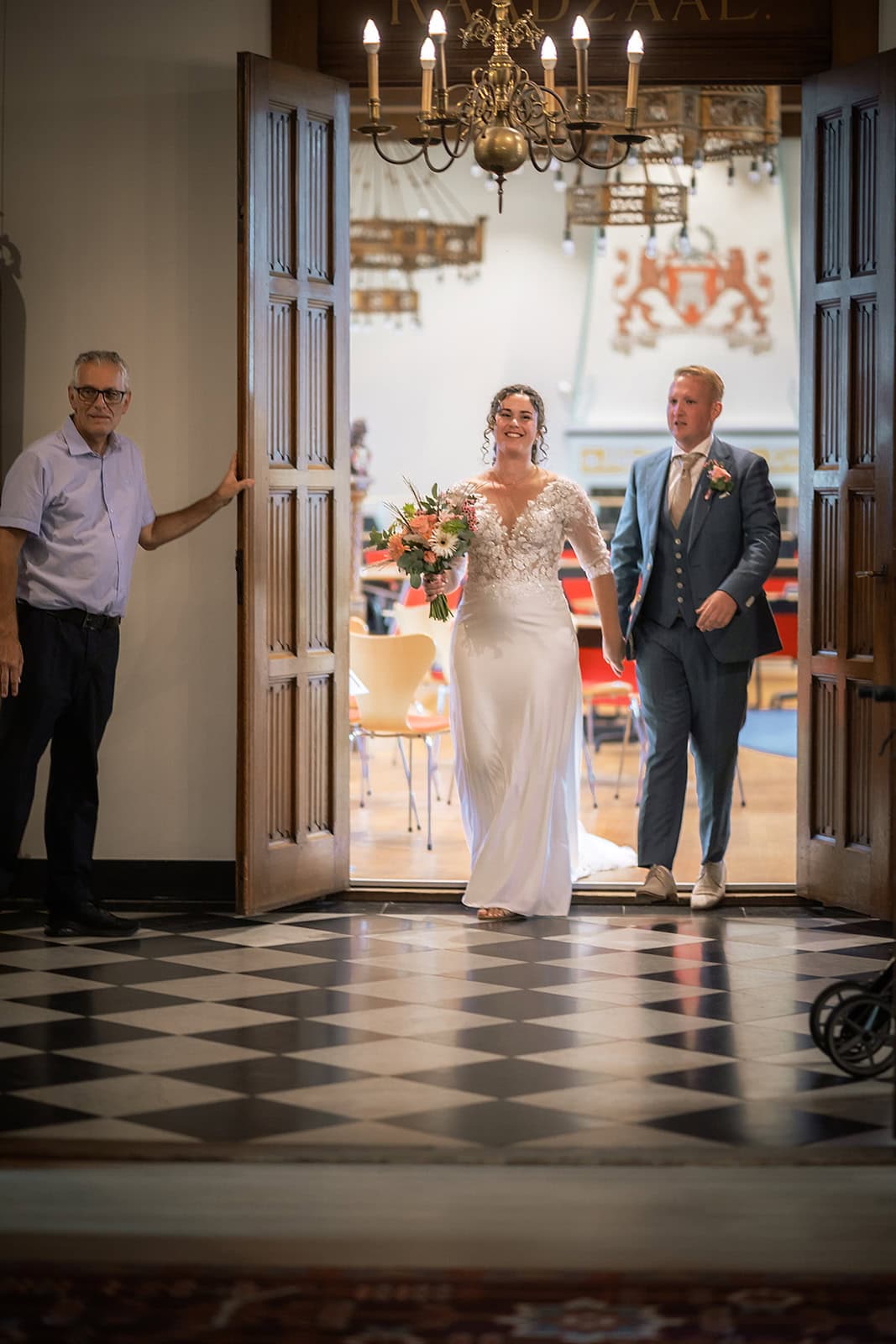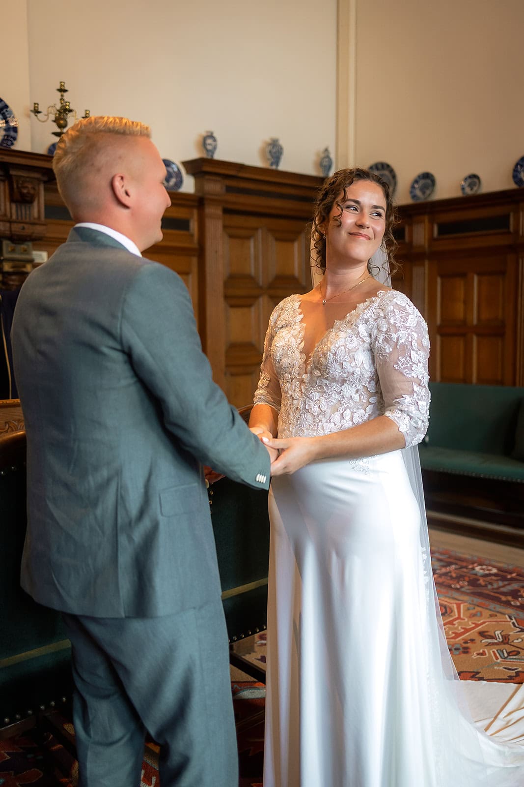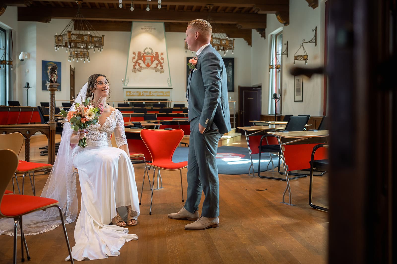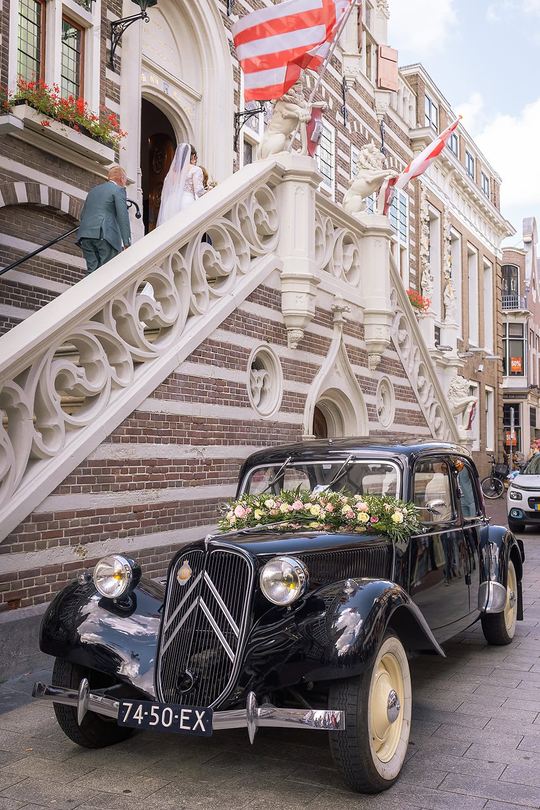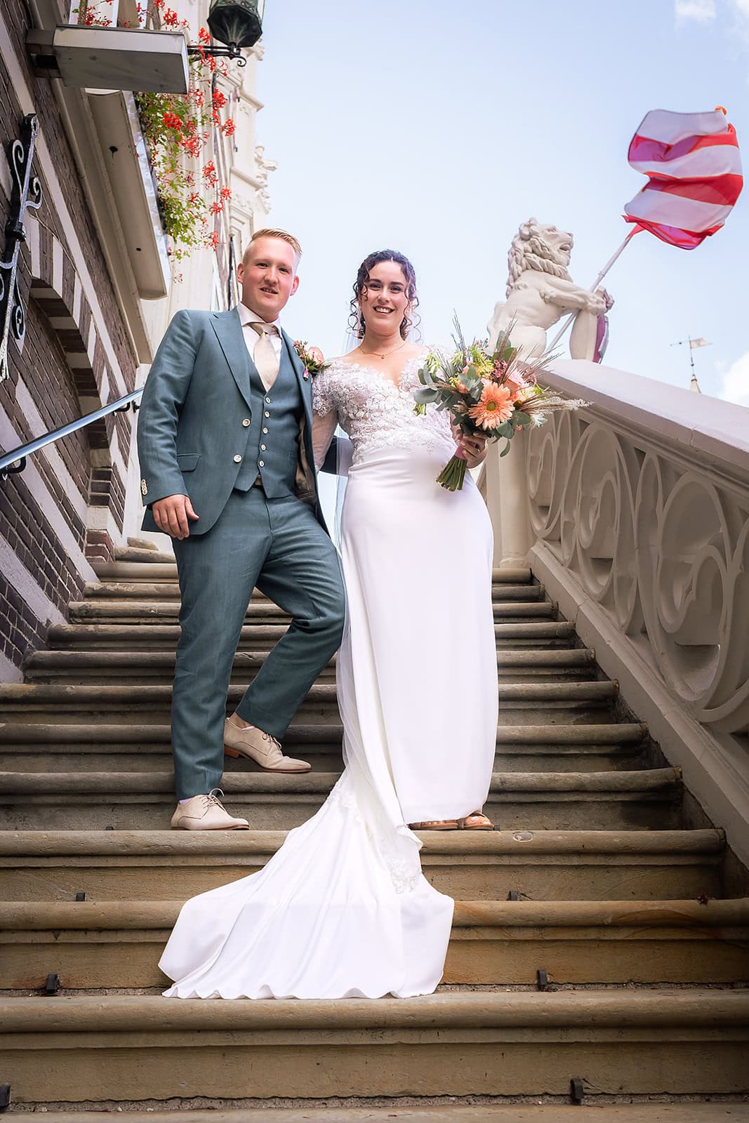 Daarna reden we naar het centrum van Alkmaar voor de ceremonie in het Stadhuis. Dit is een van de drukste plekken van de stad maar toch liep alles precies zoals gepland. In de prachtige zaal heb ik ieder moment vastgelegd tot in de kleinste details. Buiten maakten we vervolgens de groepsfoto’s op de trap van het Stadhuis.