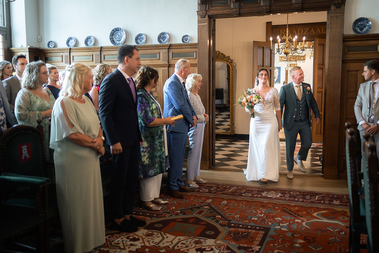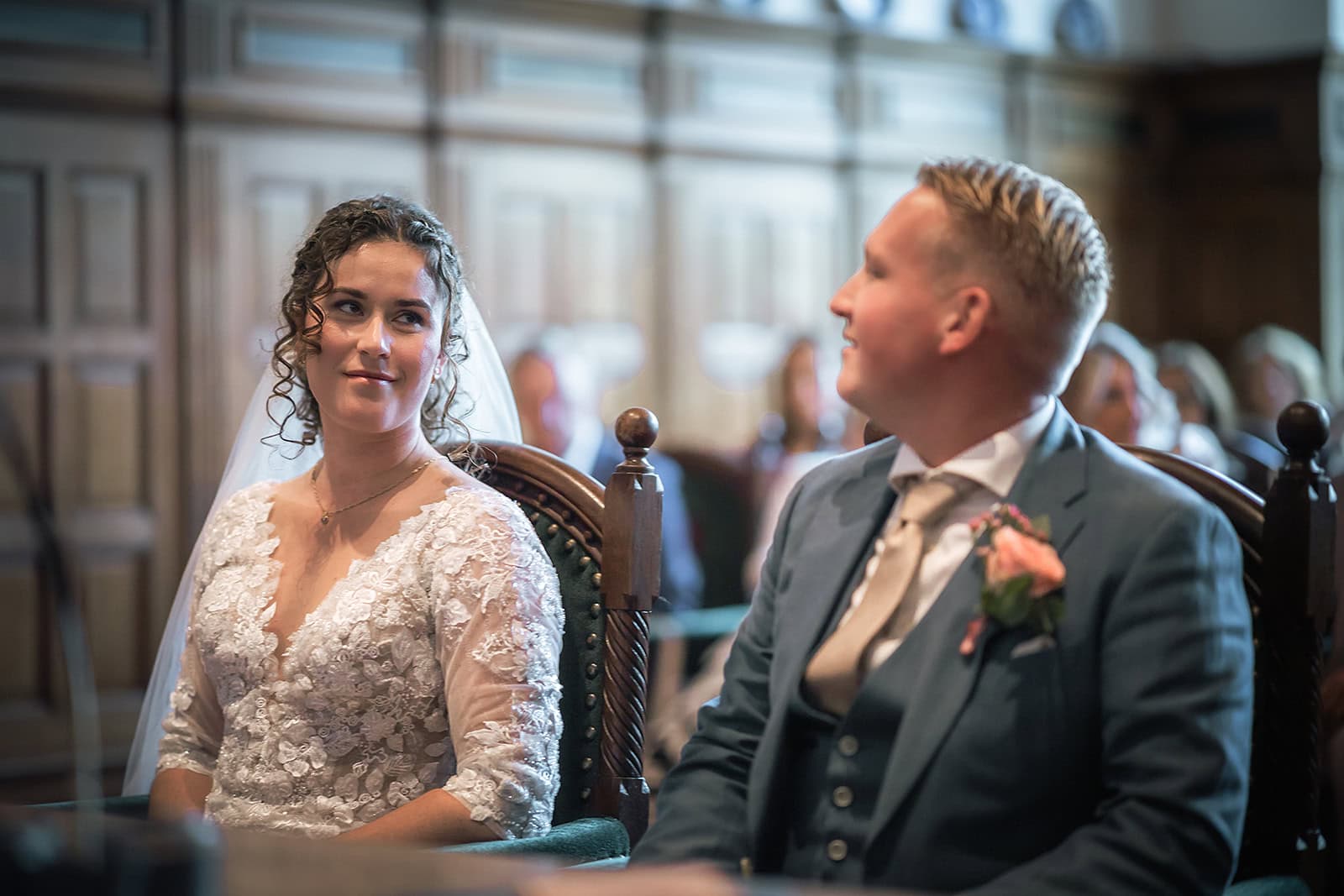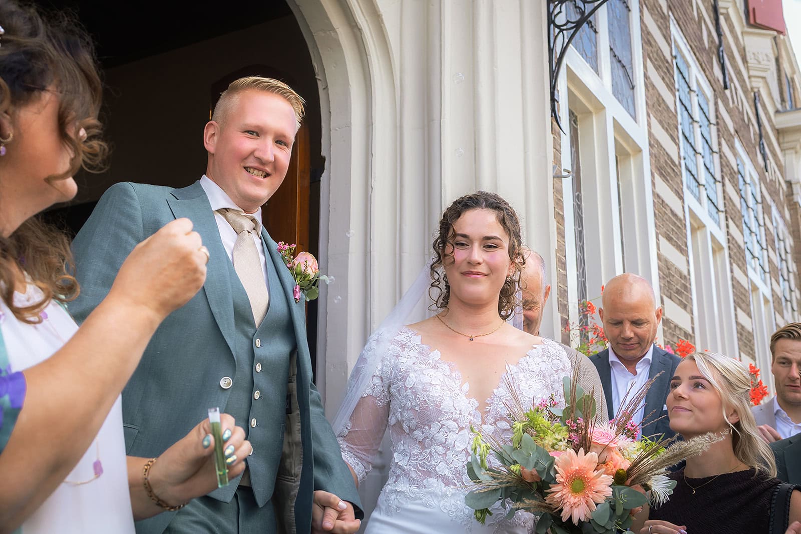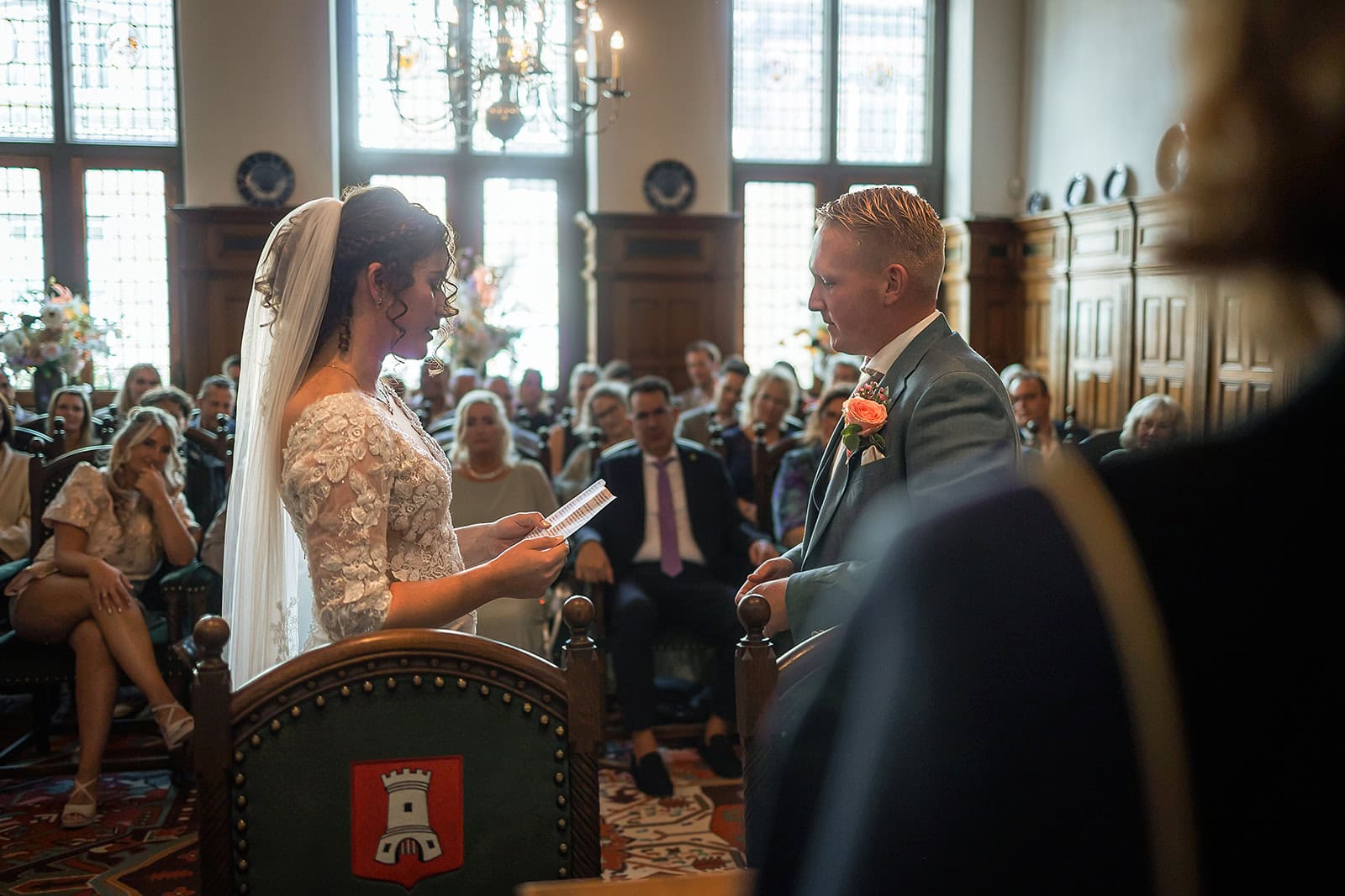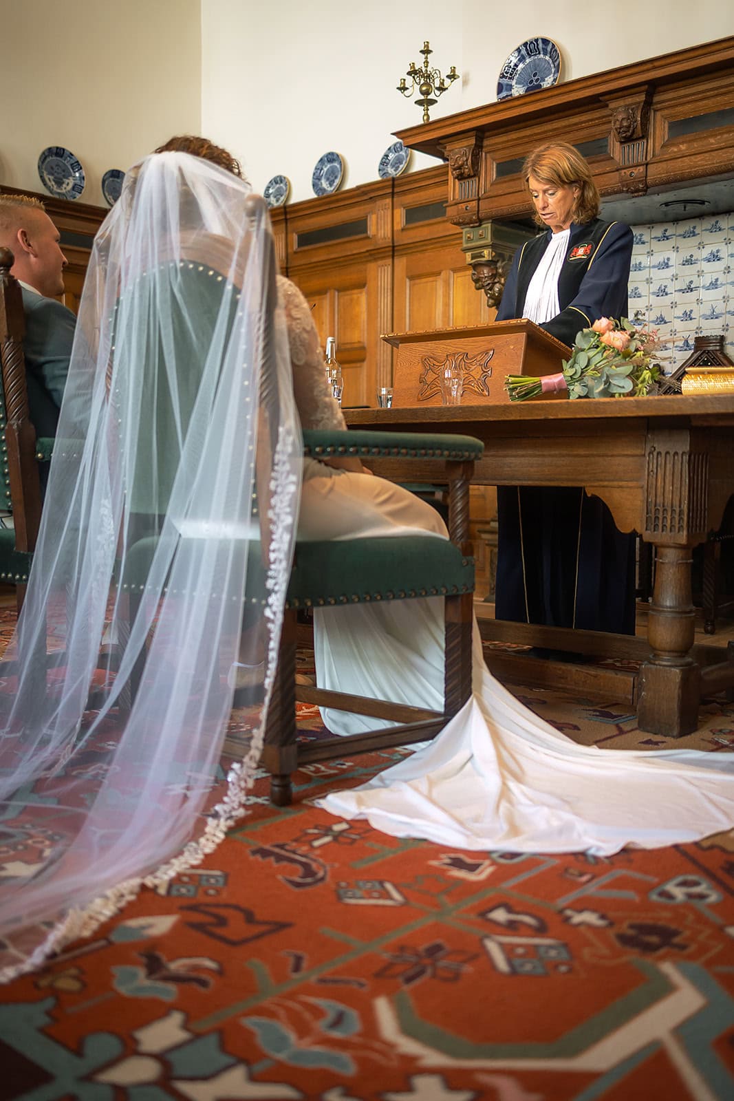 Daarna reden we naar het centrum van Alkmaar voor de ceremonie in het Stadhuis. Dit is een van de drukste plekken van de stad maar toch liep alles precies zoals gepland. In de prachtige zaal heb ik ieder moment vastgelegd tot in de kleinste details. Buiten maakten we vervolgens de groepsfoto’s op de trap van het Stadhuis.