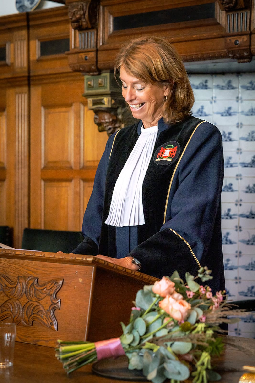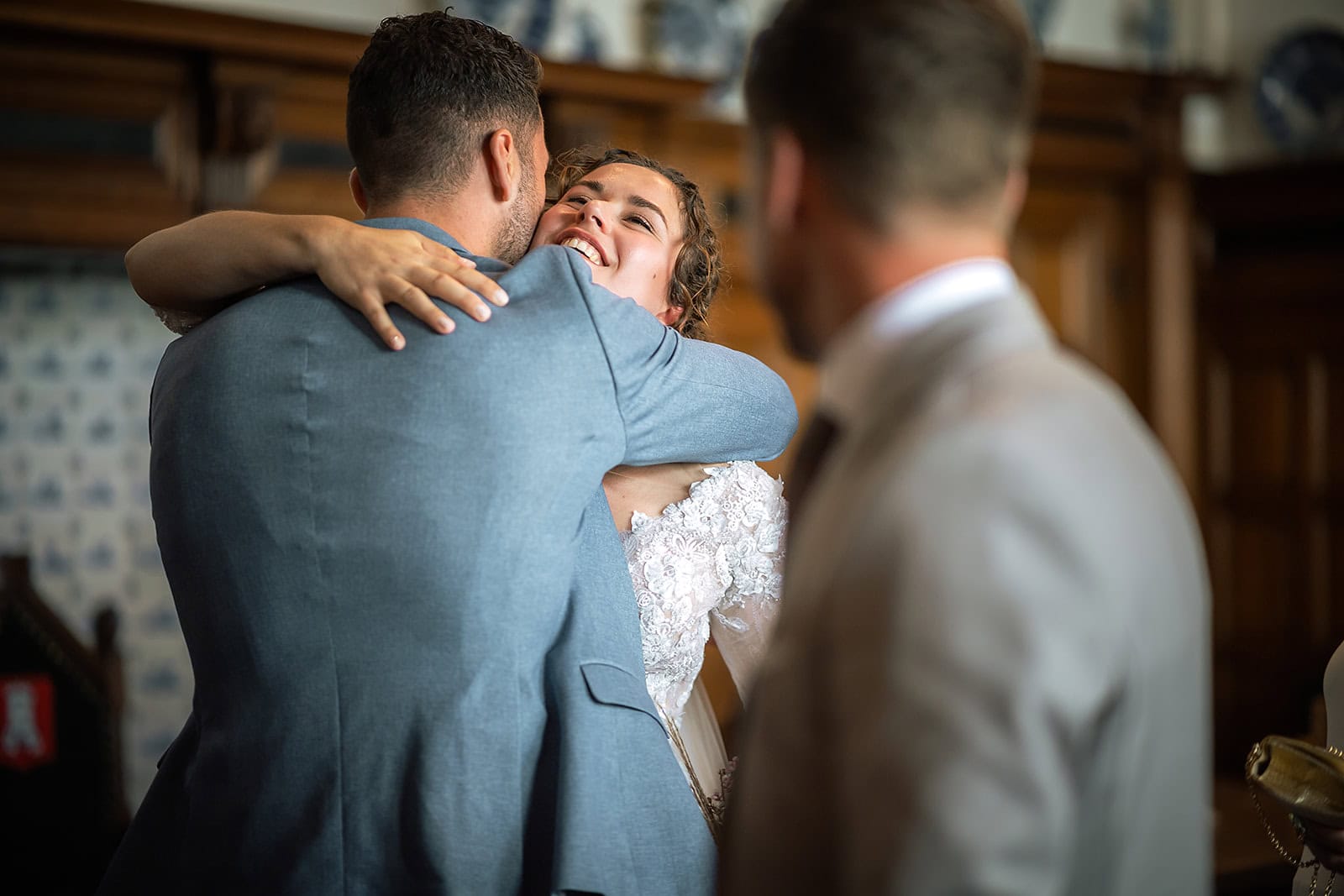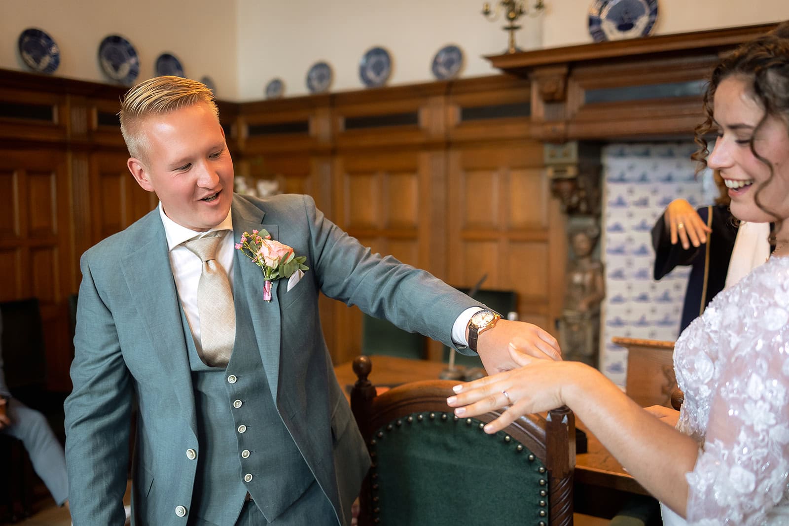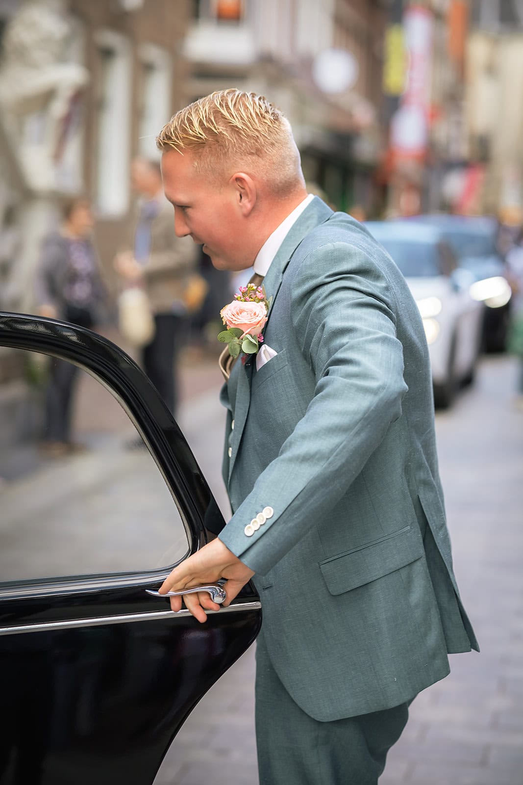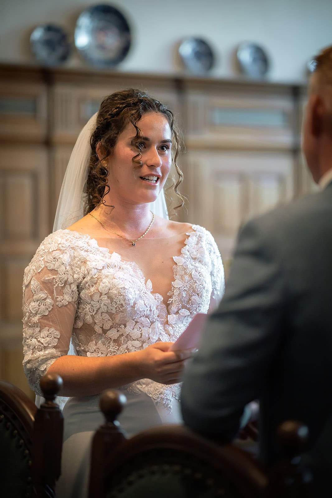 Daarna reden we naar het centrum van Alkmaar voor de ceremonie in het Stadhuis. Dit is een van de drukste plekken van de stad maar toch liep alles precies zoals gepland. In de prachtige zaal heb ik ieder moment vastgelegd tot in de kleinste details. Buiten maakten we vervolgens de groepsfoto’s op de trap van het Stadhuis.