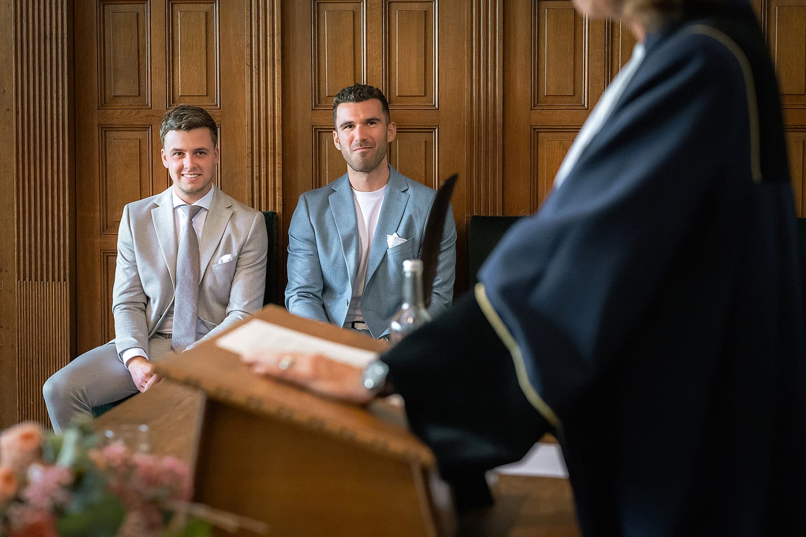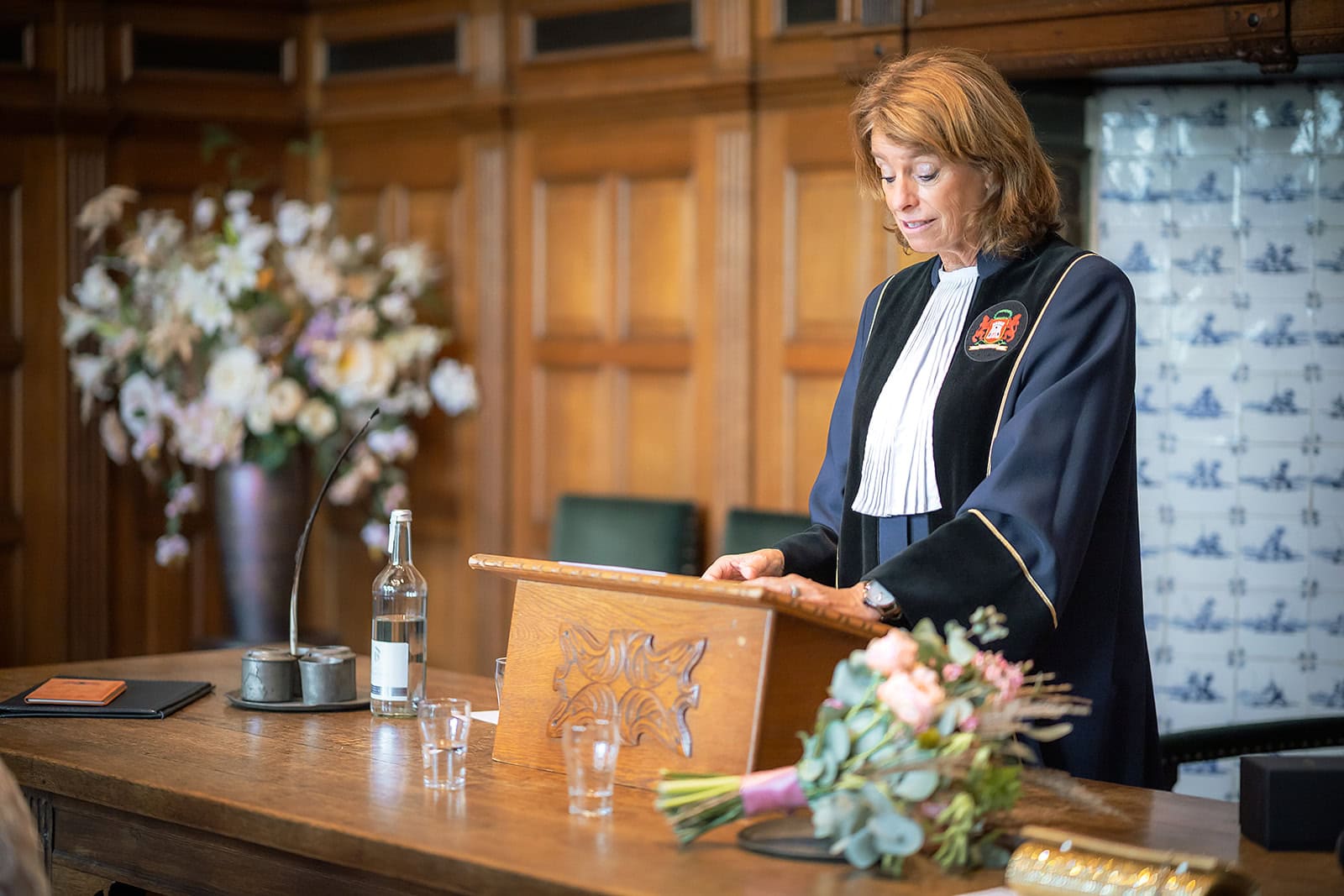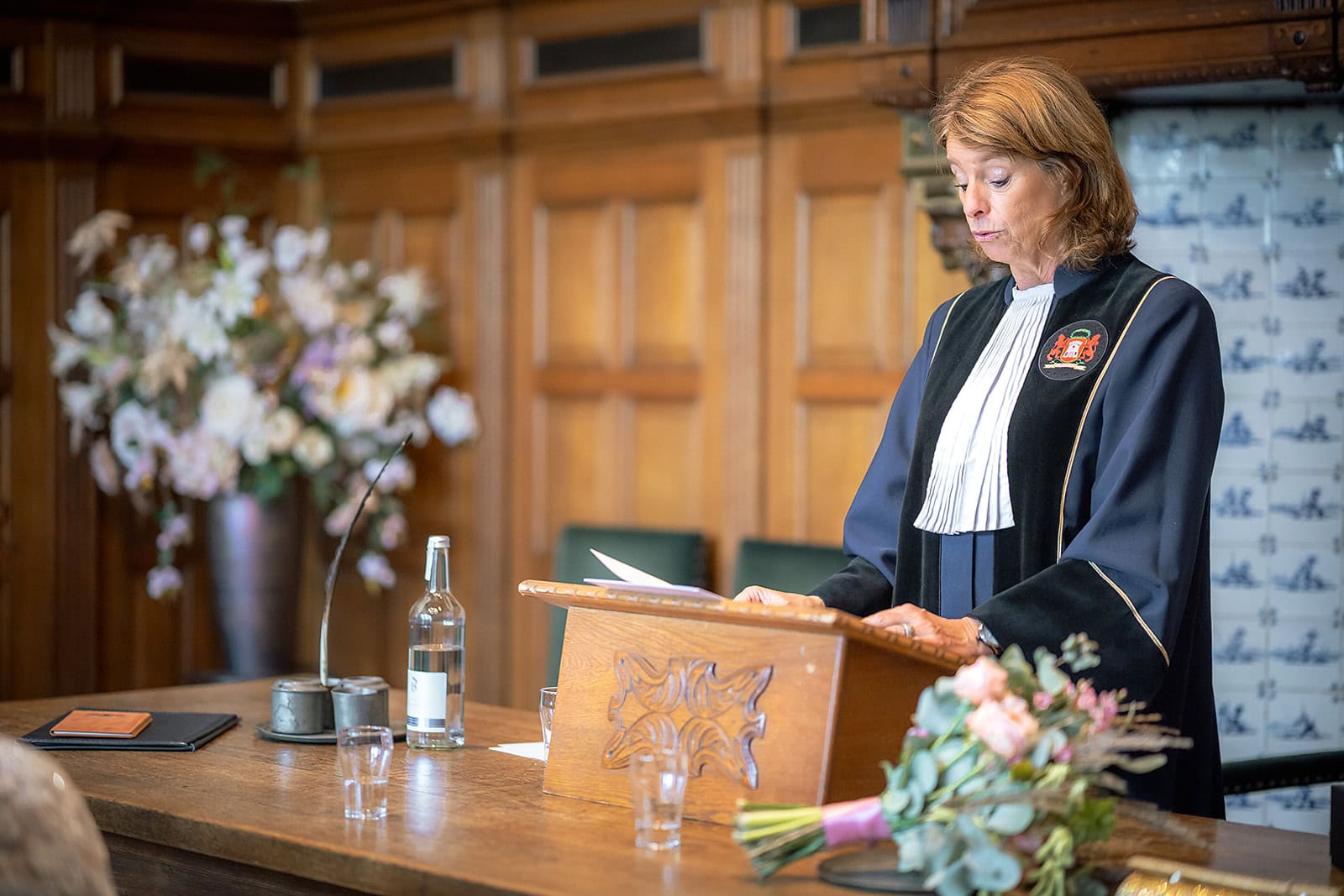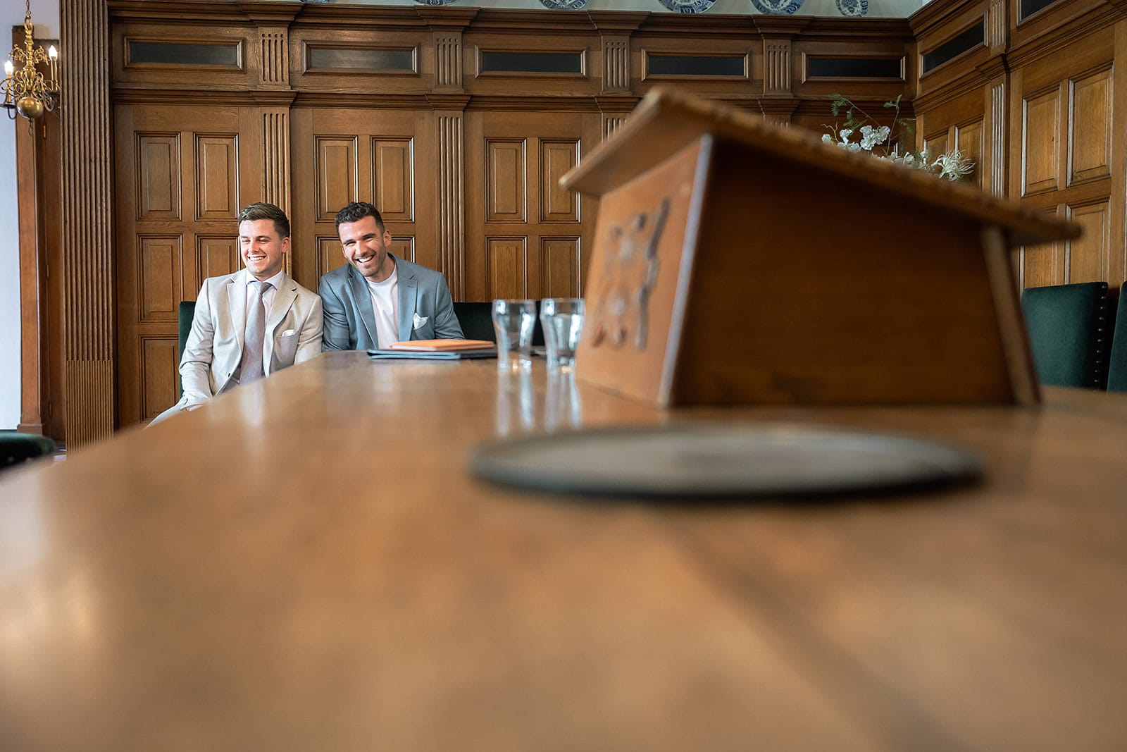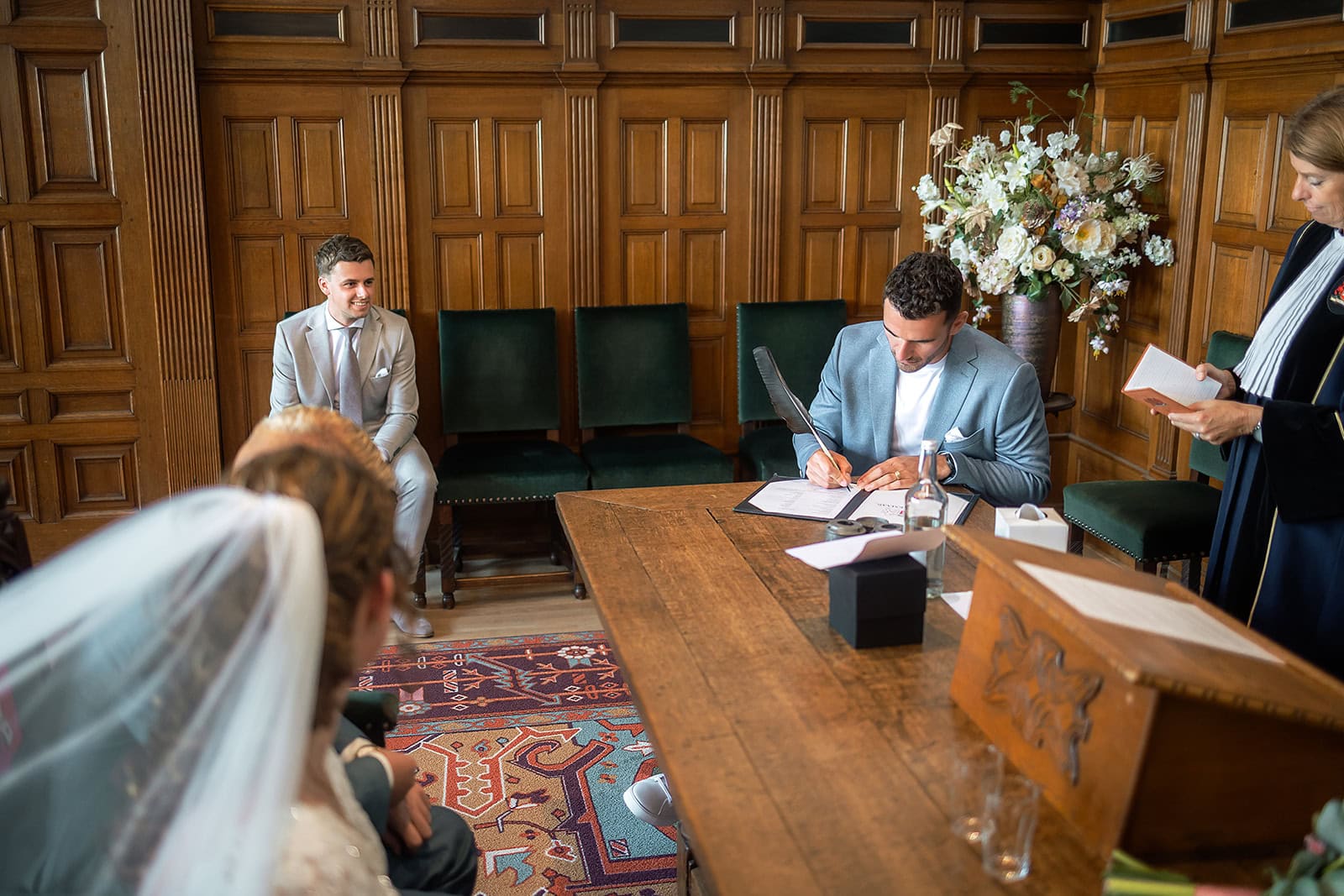Daarna reden we naar het centrum van Alkmaar voor de ceremonie in het Stadhuis. Dit is een van de drukste plekken van de stad maar toch liep alles precies zoals gepland. In de prachtige zaal heb ik ieder moment vastgelegd tot in de kleinste details. Buiten maakten we vervolgens de groepsfoto’s op de trap van het Stadhuis.