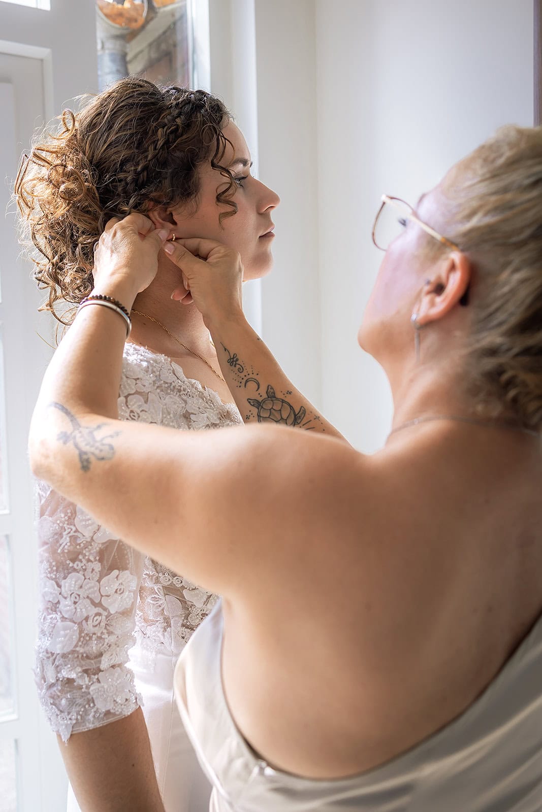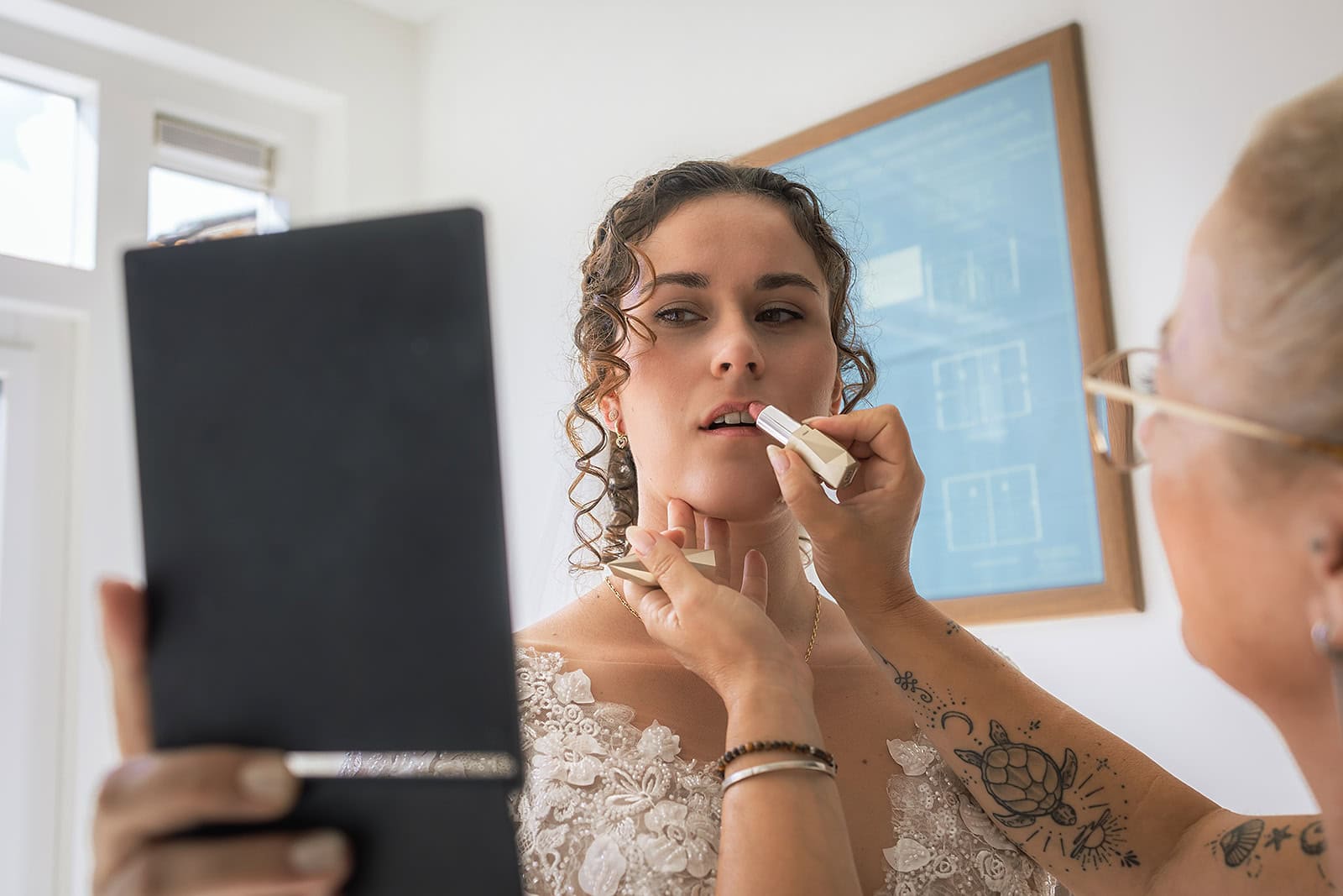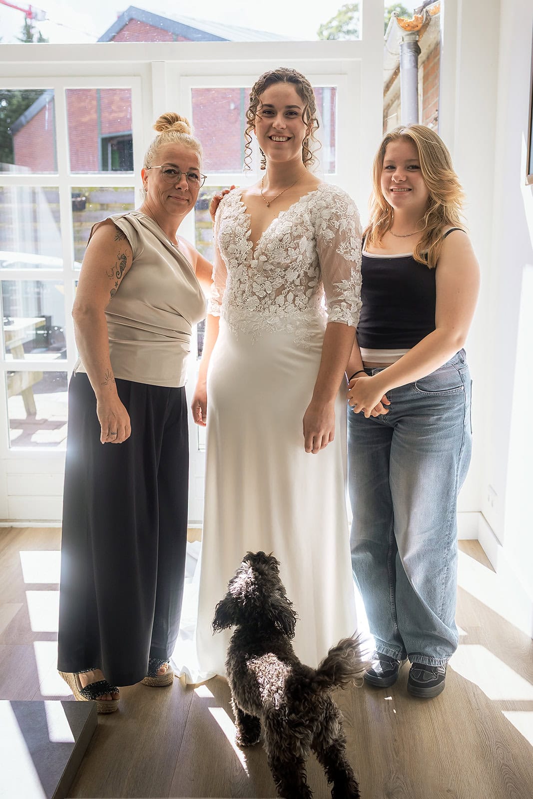 De ochtend begon rustig en ontspannen bij Nienke thuis. Alleen Nienke haar kapper en de dochter van de kapper waren aanwezig. Ik vind het altijd belangrijk om het bruidspaar eerst even op hun gemak te laten komen. Terwijl zij verder gingen met het klaarmaken begon ik met het vastleggen van haar jurk en de mooie details. Toen ik de jurk buiten ophing kwam de hond nieuwsgierig kijken en dat leverde een onverwacht leuke foto op. Een beeld dat straks echt een herinnering voor altijd is.