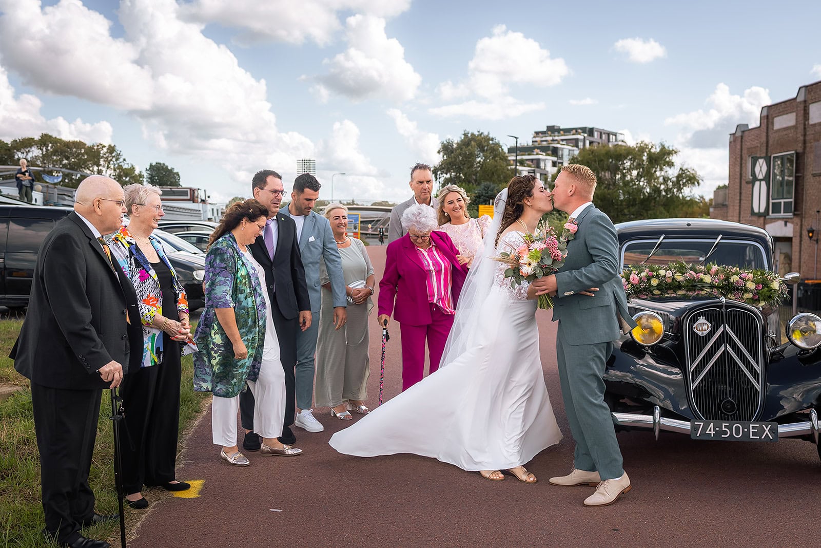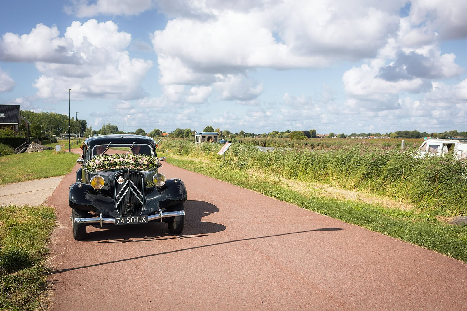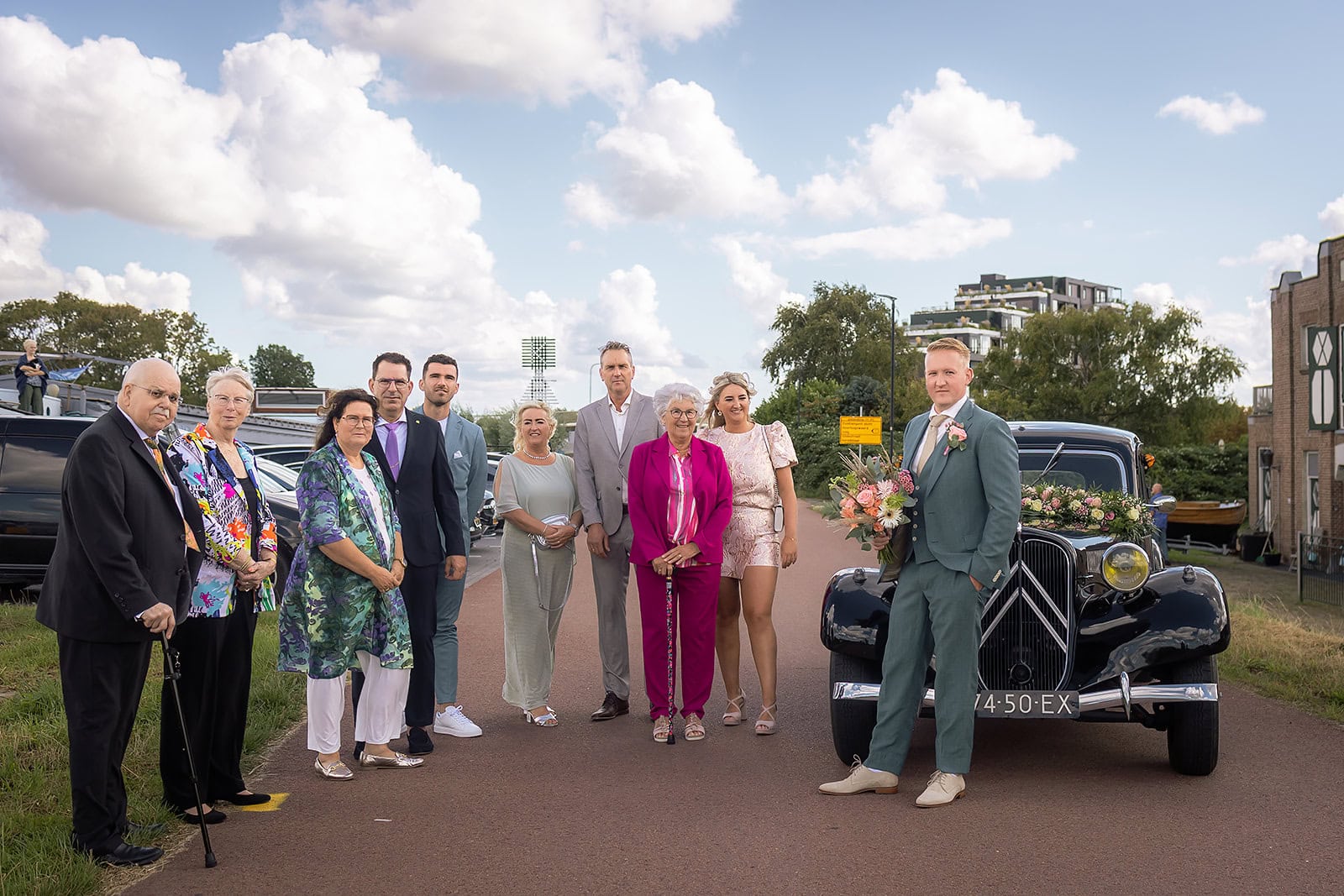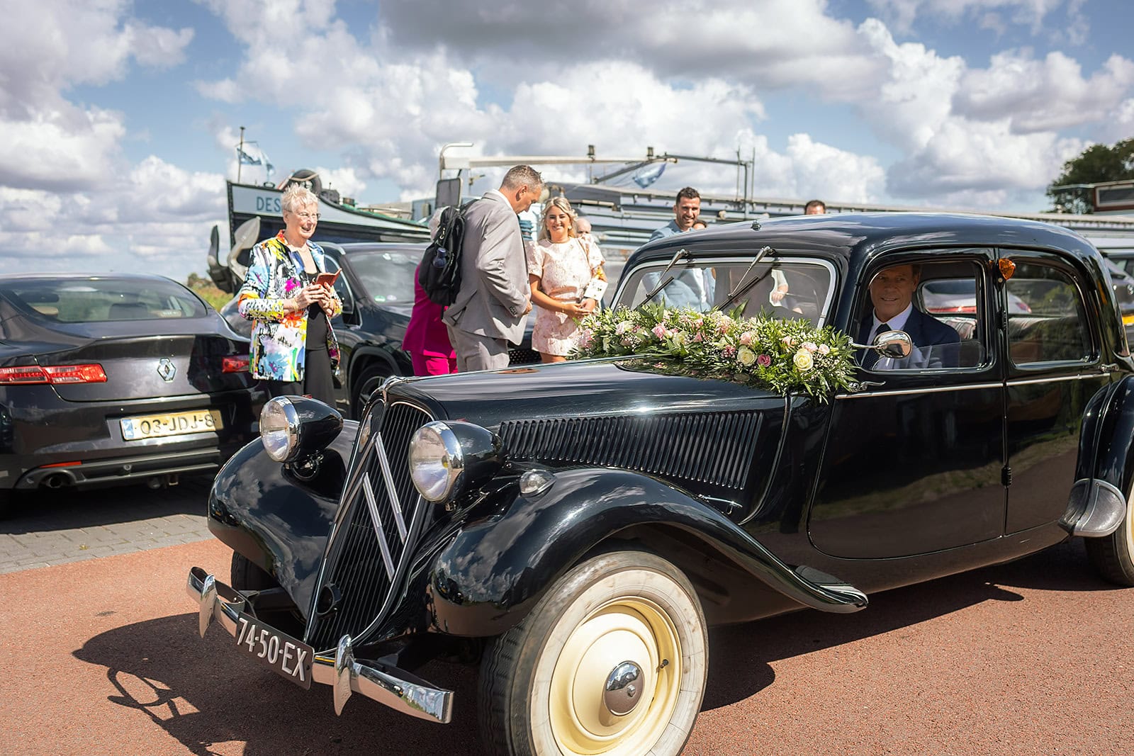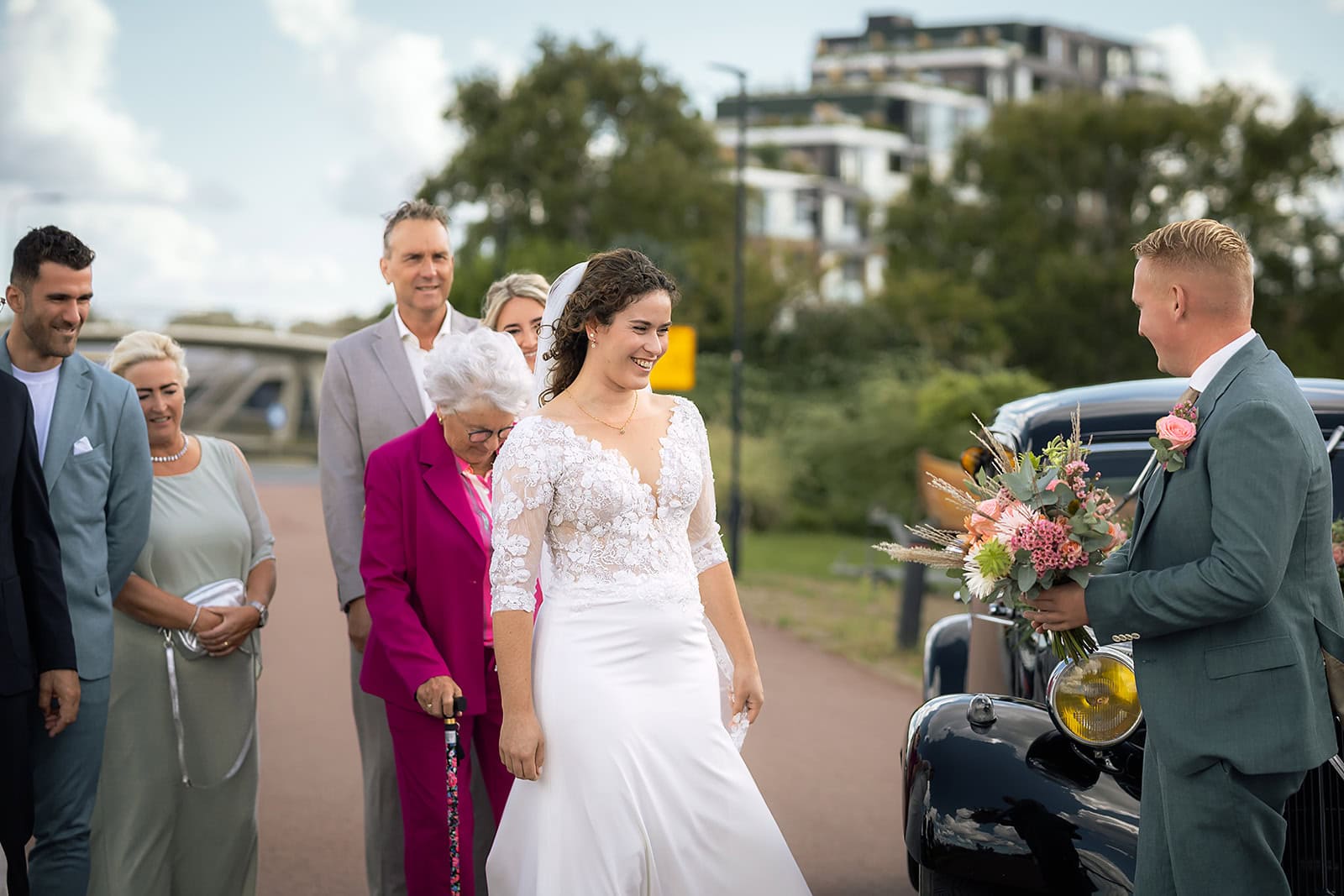 Steven stuurde mij zijn locatie en ik wist dat de familie buiten op hem stond te wachten. Ik bereidde alles voor bij hun trouwauto een prachtige authentieke Citroen Traction Avant. Iedereen stond klaar en Nienke liep langzaam de dijk op. Het moment dat ze elkaar voor het eerst zagen was intiem puur en heel mooi om vast te leggen.
