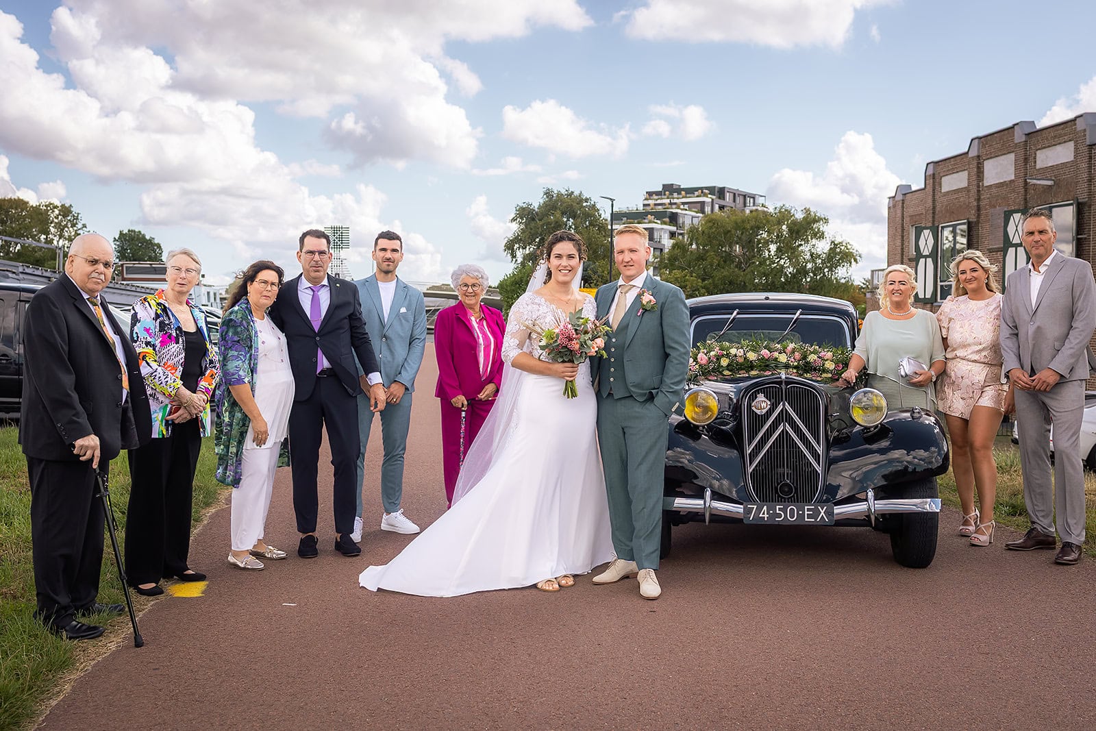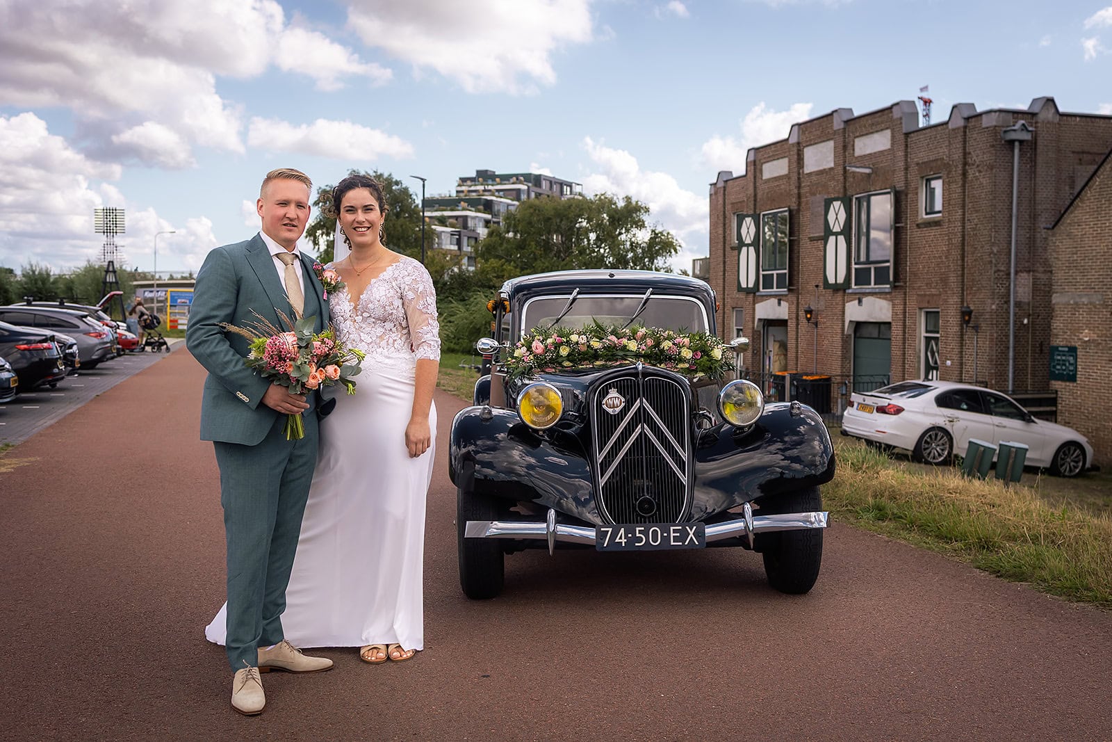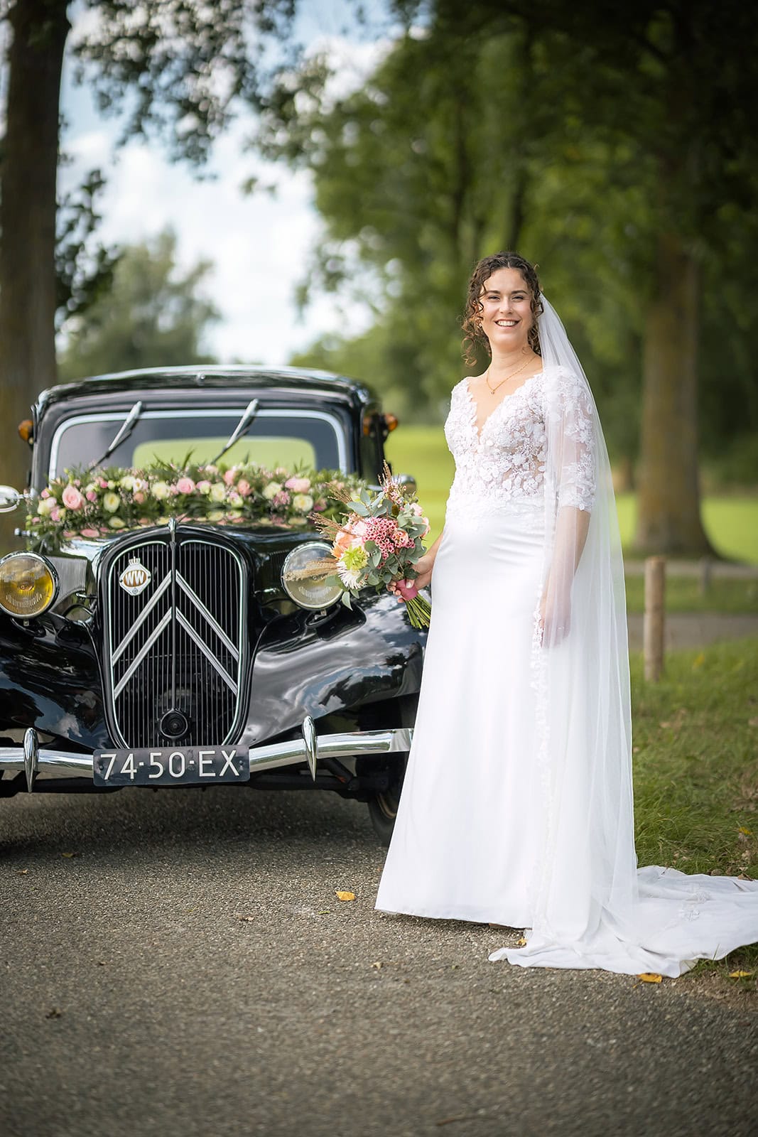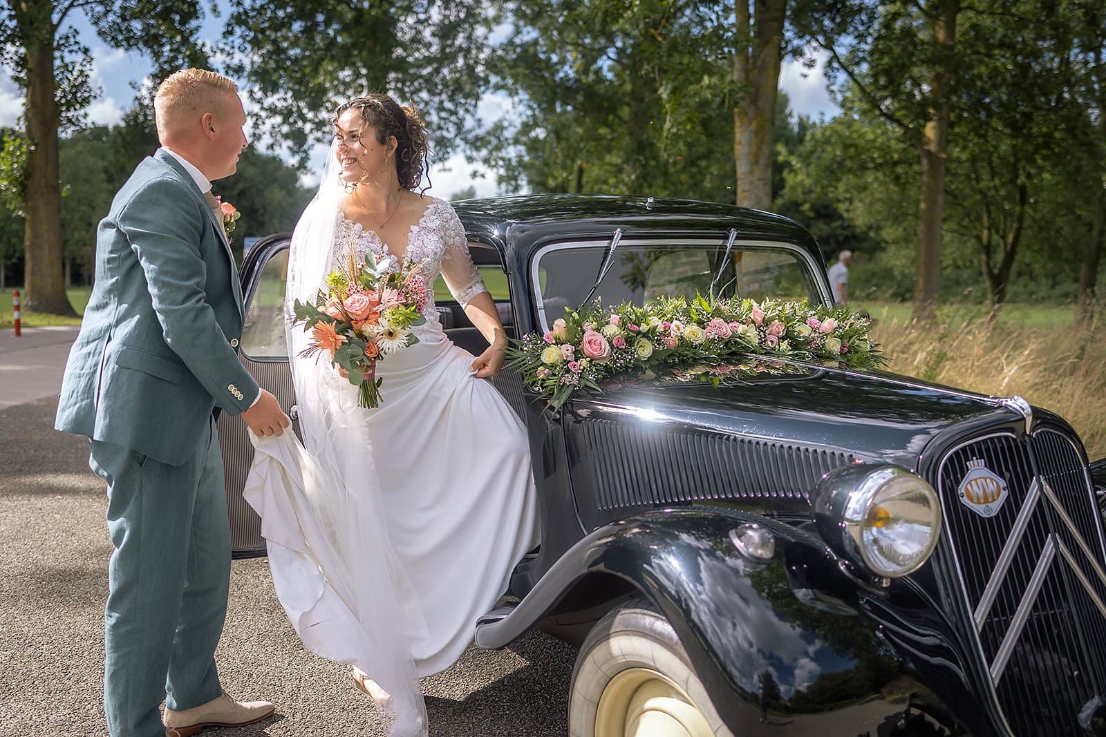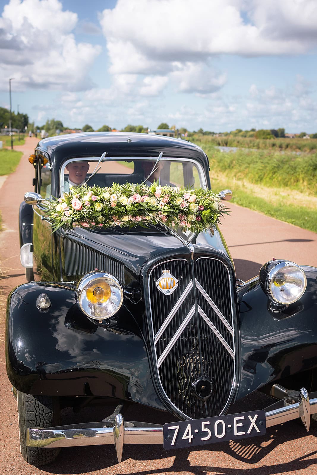 Steven stuurde mij zijn locatie en ik wist dat de familie buiten op hem stond te wachten. Ik bereidde alles voor bij hun trouwauto een prachtige authentieke Citroen Traction Avant. Iedereen stond klaar en Nienke liep langzaam de dijk op. Het moment dat ze elkaar voor het eerst zagen was intiem puur en heel mooi om vast te leggen.