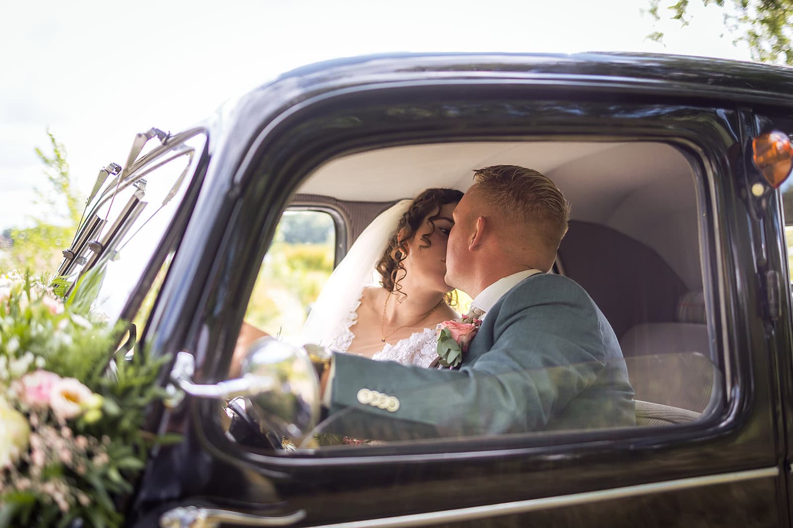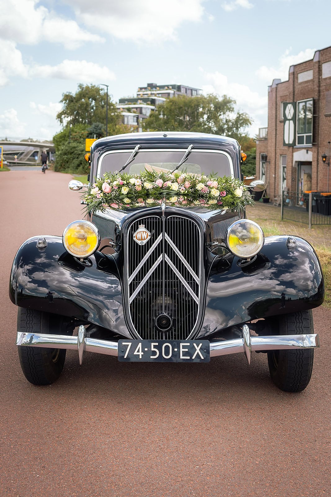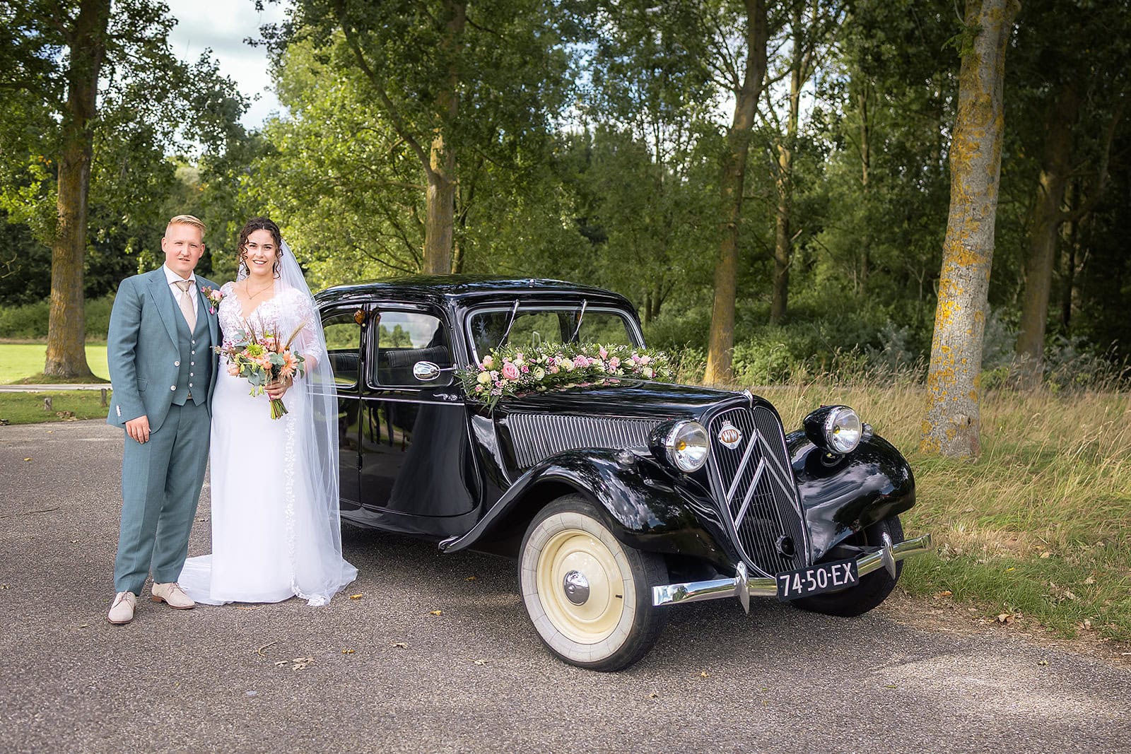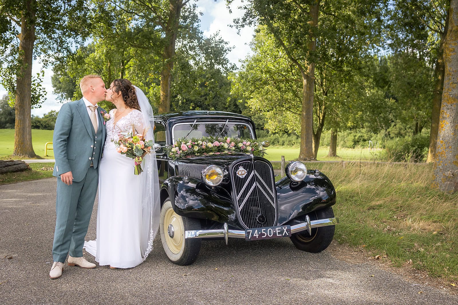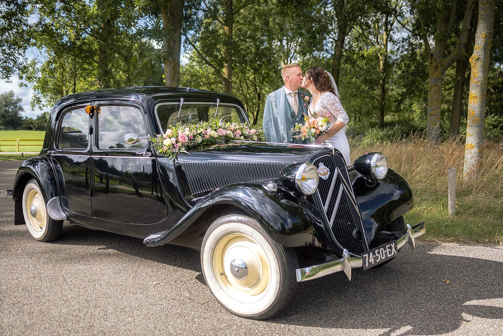 Steven stuurde mij zijn locatie en ik wist dat de familie buiten op hem stond te wachten. Ik bereidde alles voor bij hun trouwauto een prachtige authentieke Citroen Traction Avant. Iedereen stond klaar en Nienke liep langzaam de dijk op. Het moment dat ze elkaar voor het eerst zagen was intiem puur en heel mooi om vast te leggen.