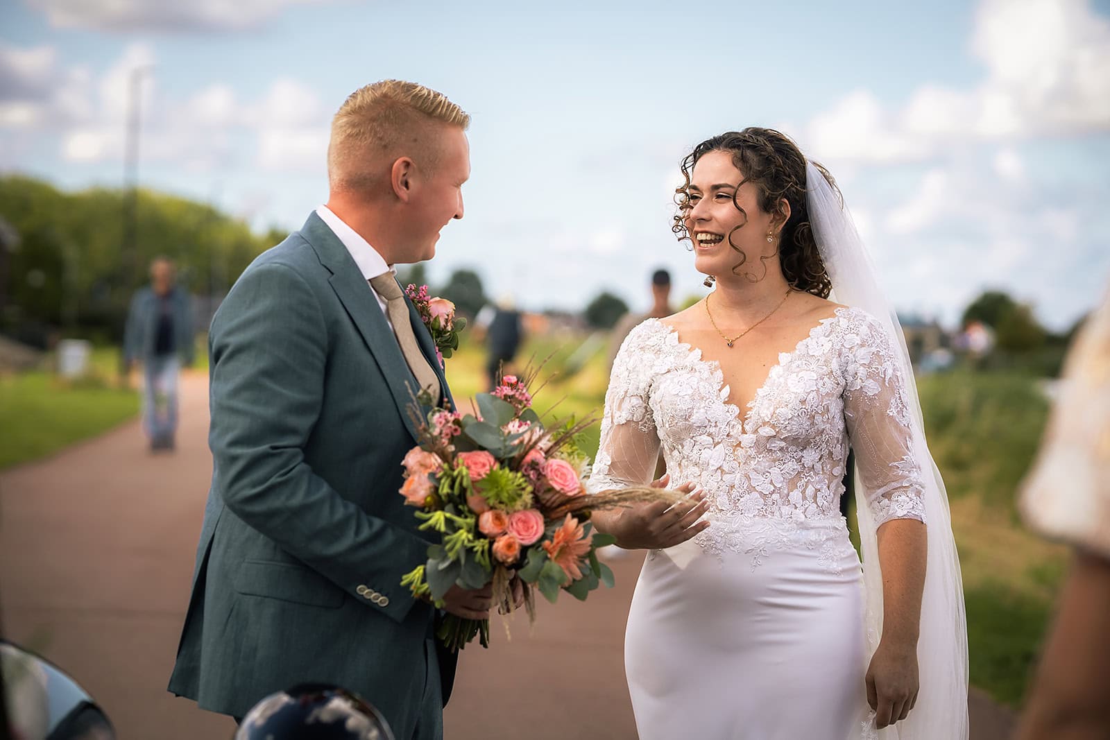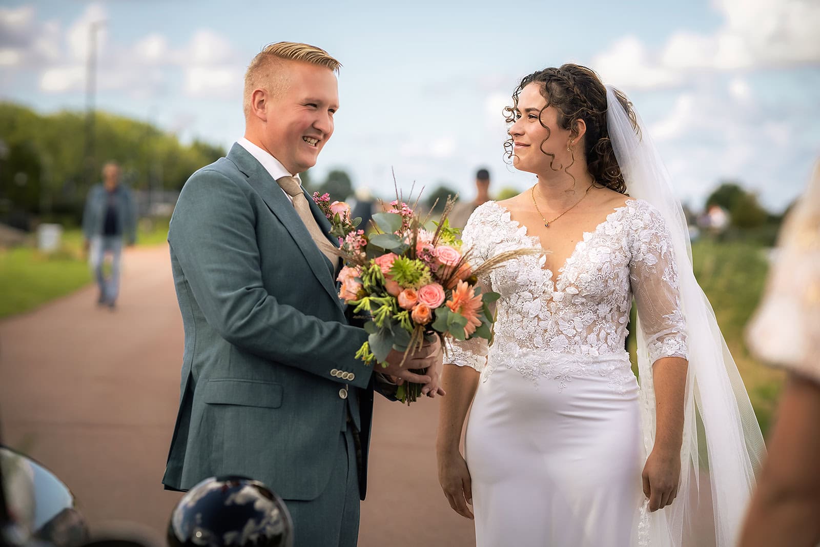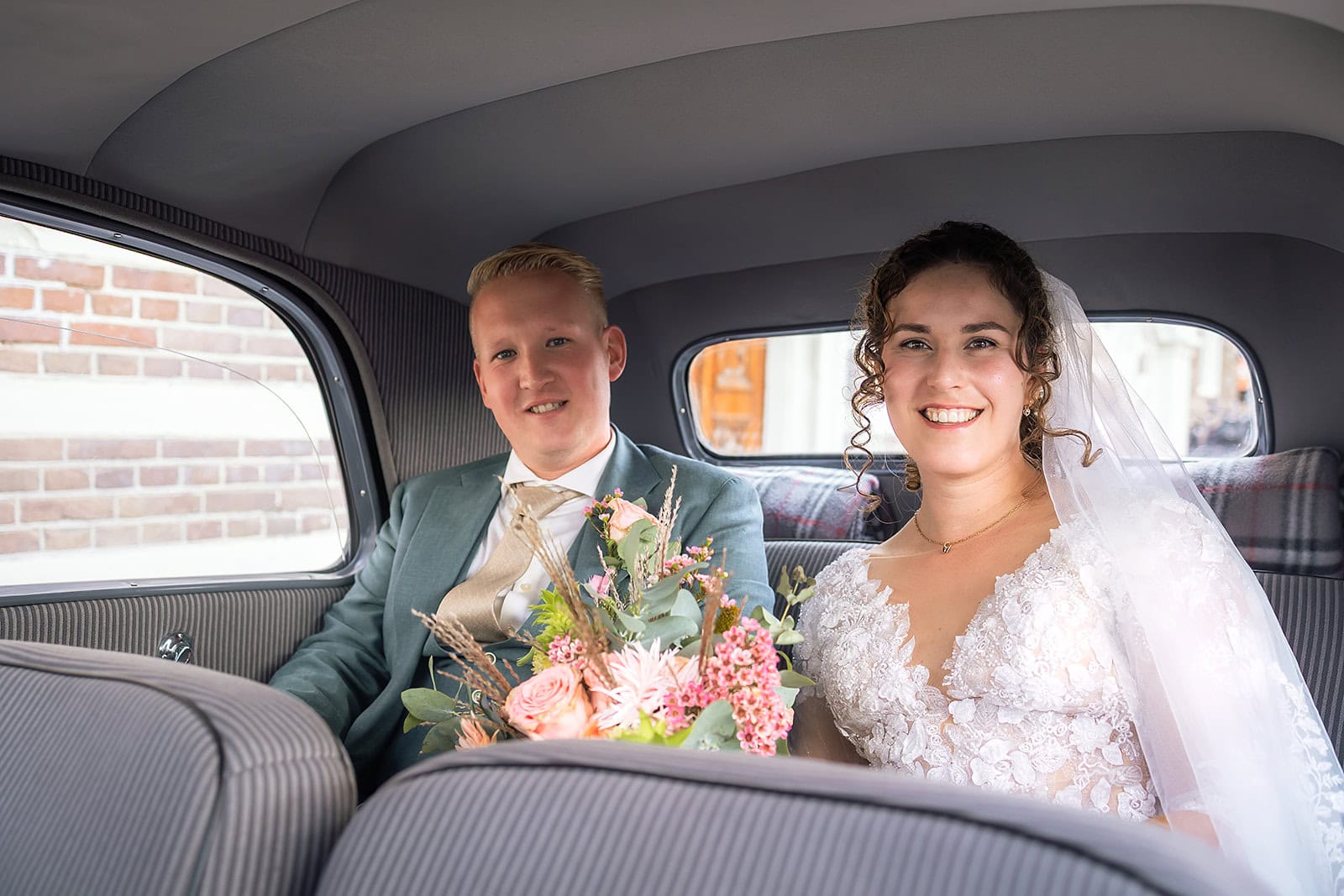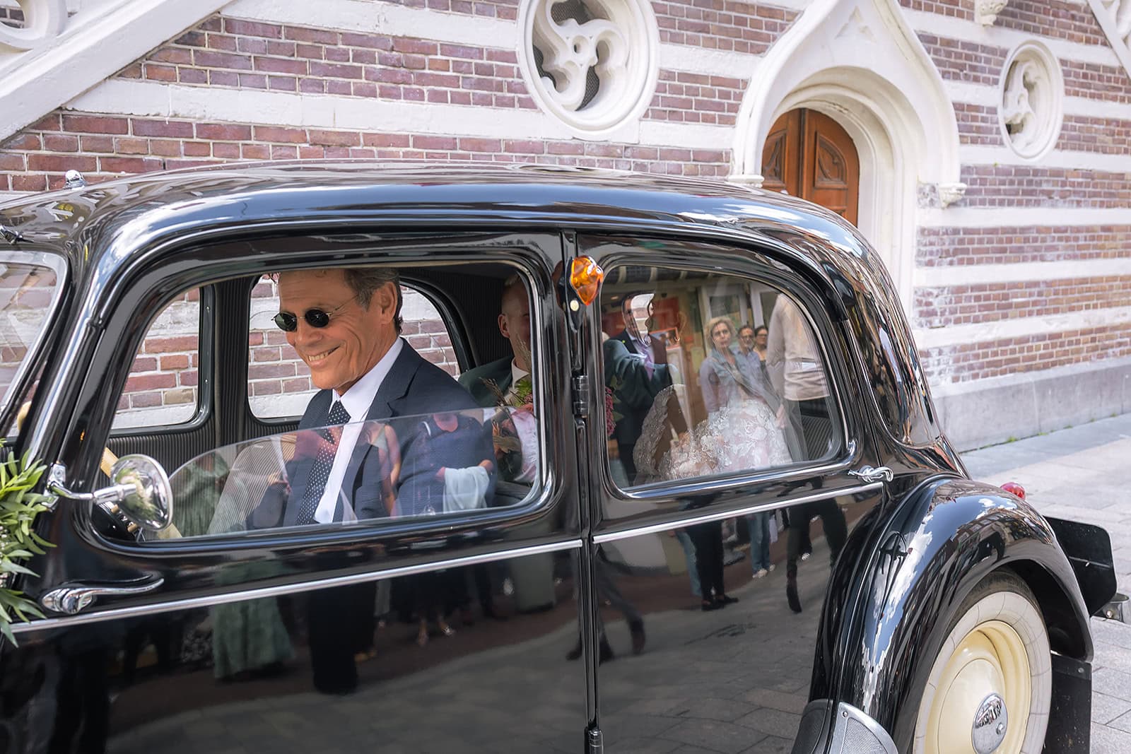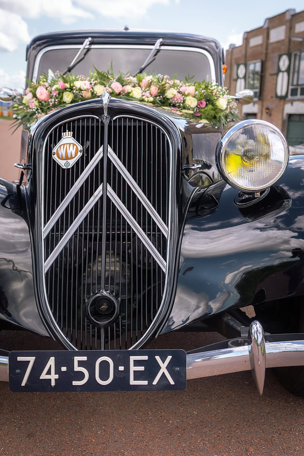 Steven stuurde mij zijn locatie en ik wist dat de familie buiten op hem stond te wachten. Ik bereidde alles voor bij hun trouwauto een prachtige authentieke Citroen Traction Avant. Iedereen stond klaar en Nienke liep langzaam de dijk op. Het moment dat ze elkaar voor het eerst zagen was intiem puur en heel mooi om vast te leggen.